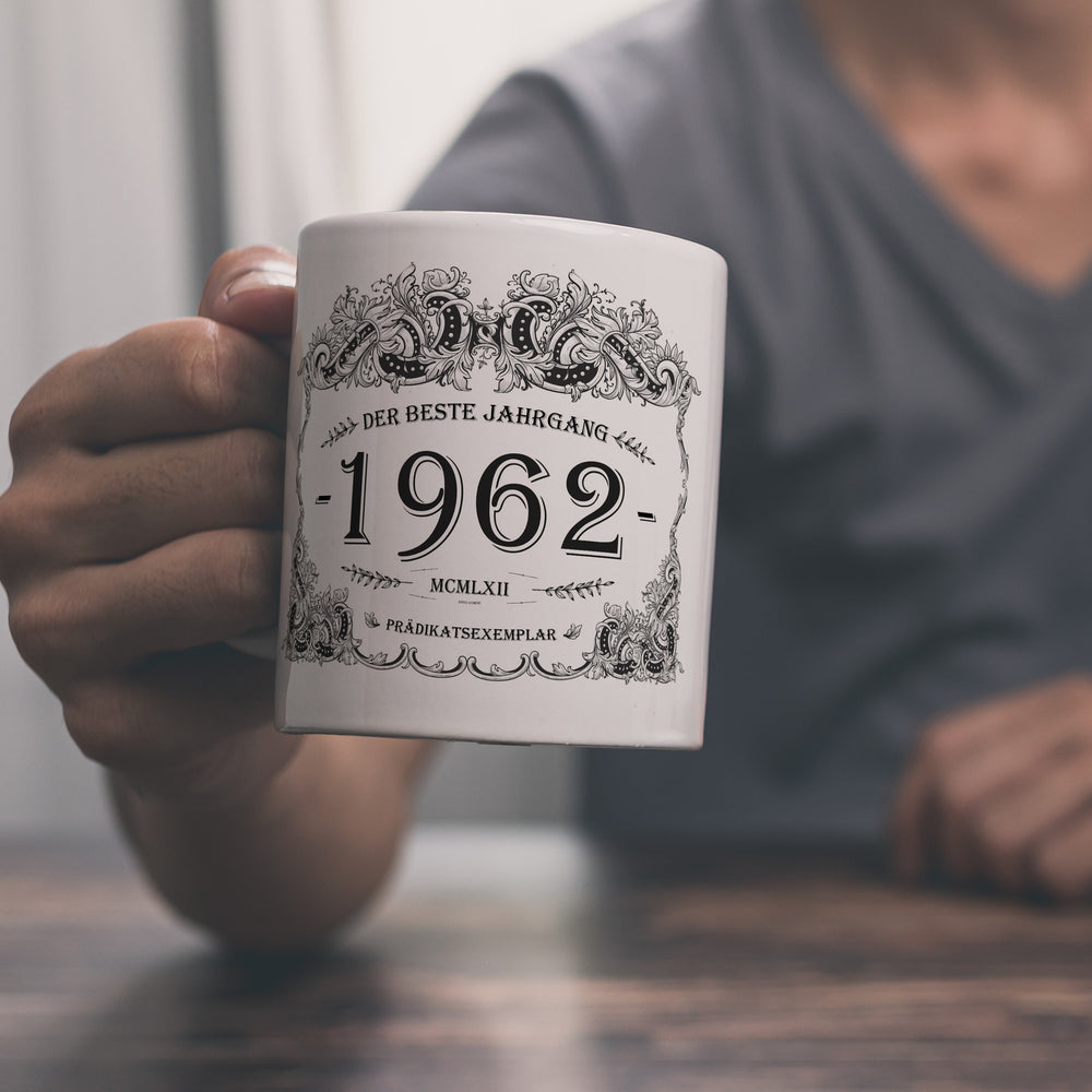 • 1962 ist einfach der beste Jahrgang. Aus diesem Kaffeebecher schmeckt der Morgenkaffee zeitlebens einfach am Besten! Ein tolles Geschenk zum [ber_jahrgeb]. Geburtstag