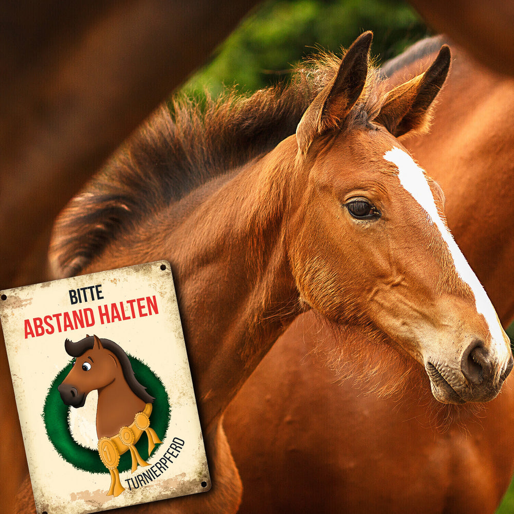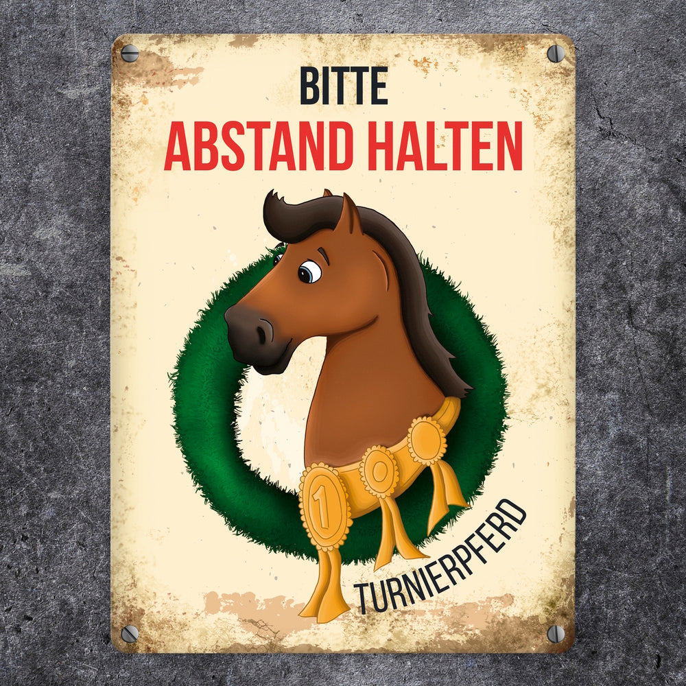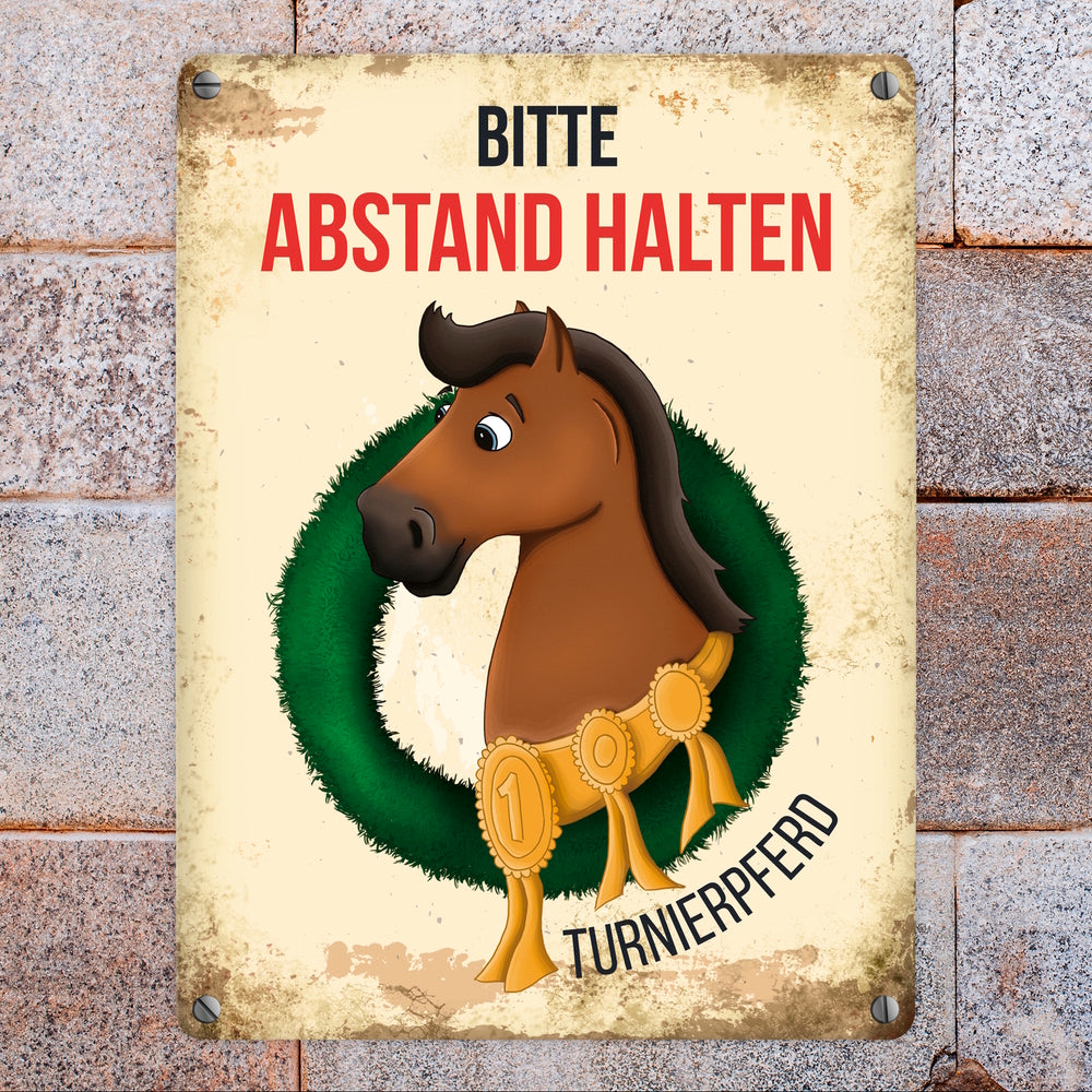 Metallschild mit braunem Turnierpferd Motiv und Spruch: Bitte Abstand halten