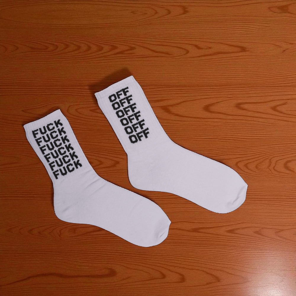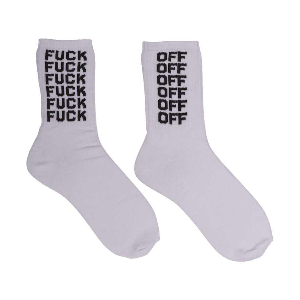 • Diese weißen Tennissocken sind nicht nur bequem, sondern auch ein echter Hingucker. Am Schaft prangt mehrmals das freche "FUCK OFF" in schwarz. So sorgen sie für Lacher und neugierige Blicke – ein fabelhafter Fuck You Moment für alle Beteiligten.