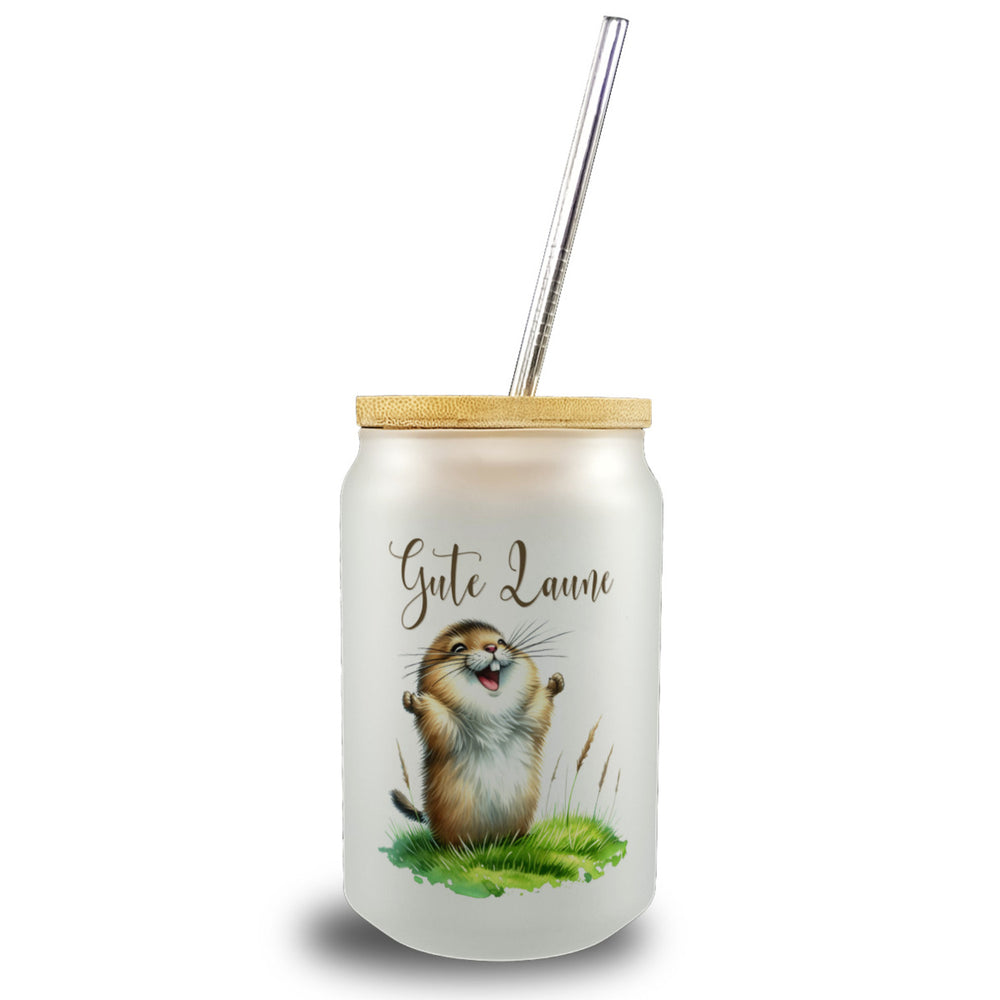 jubelnder Lemming Trinkglas mit Bambusdeckel mit Spruch Gute Laune