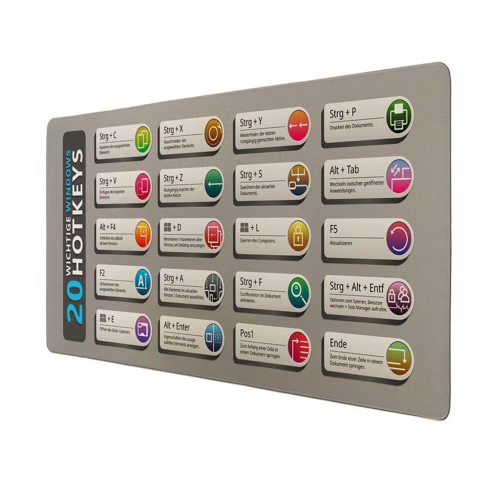 • Diese Schreibtischunterlage ist ein wahres Kunstwerk für Computerliebhaber! Auf einem eleganten grauen Hintergrund sind 20 farbenfrohe, kreisförmige Buttons mit den wichtigsten Windows-Hotkeys abgebildet. Jede Taste ist liebevoll mit einem einzigartigen Symbol und einer deutschen Beschreibung versehen. Der Titel "20 WICHTIGE HOTKEYS" thront stolz oben.