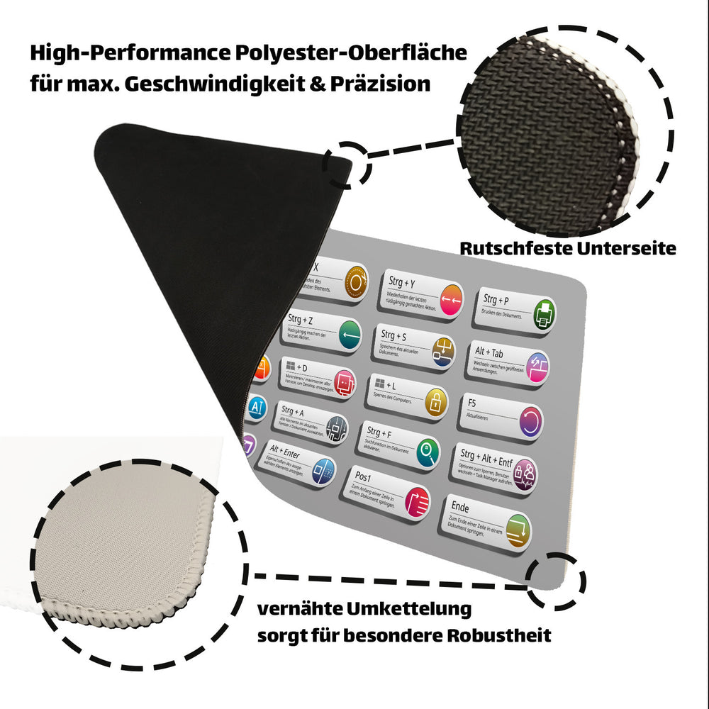 • 1x Windows Hotkeys Schreibtischunterlage 69x31cm XXL Mauspad - 20 Wichtige Hotkeys in der gewählten Größe