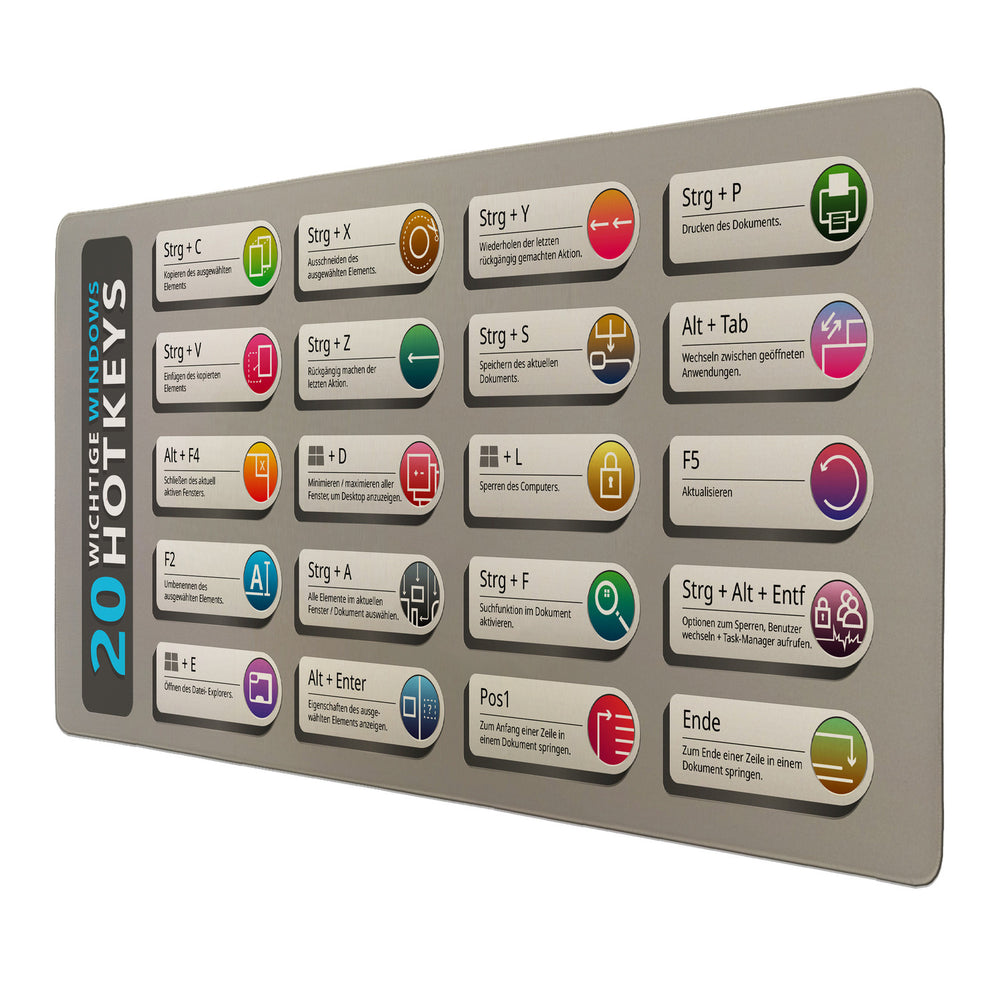 Windows Hotkeys Schreibtischunterlage 69x31cm XXL Mauspad - 20 Wichtige Hotkeys