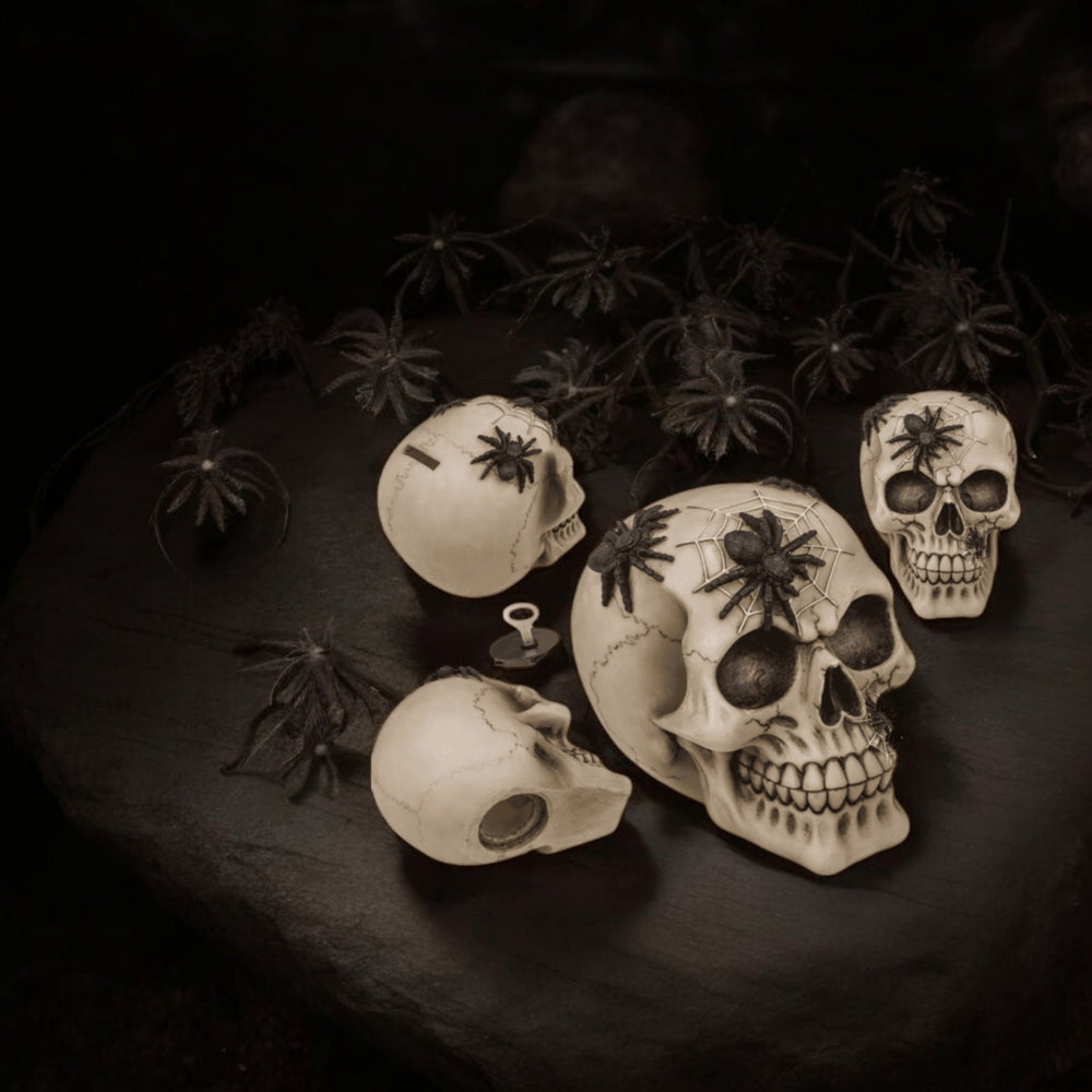- Brauchen Sie eine Möglichkeit, Ihr Erspartes sicher und stilgerecht zu verstauen? Die Totenkopf mit Spinnen Spardose ist die perfekte Lösung für alle Sparfüchse, die ihrem Geldversteck einen gruseligen Touch verleihen wollen. Ideal für alle Halloween-Fans und Liebhaber ungewöhnlicher Totenkopf Geschenke!