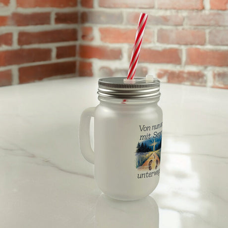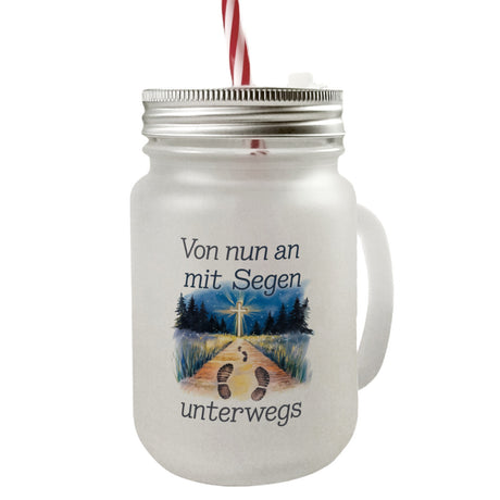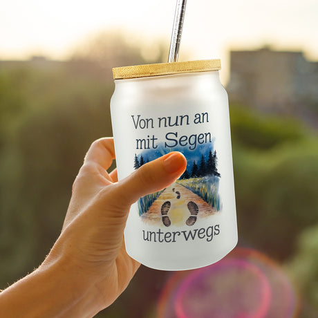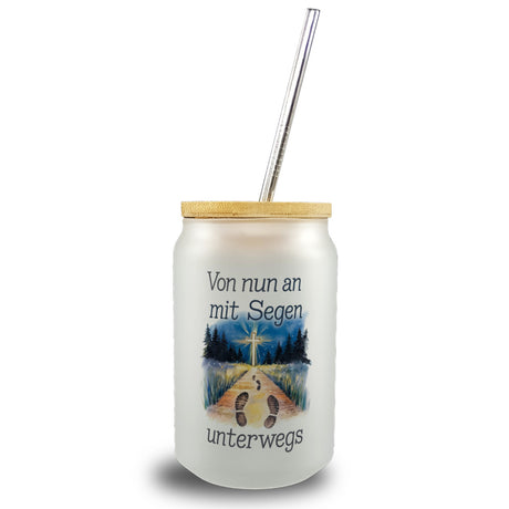 Mit Segen unterwegs Trinkglas mit Bambusdeckel - Segenstrahlendes Kreuz