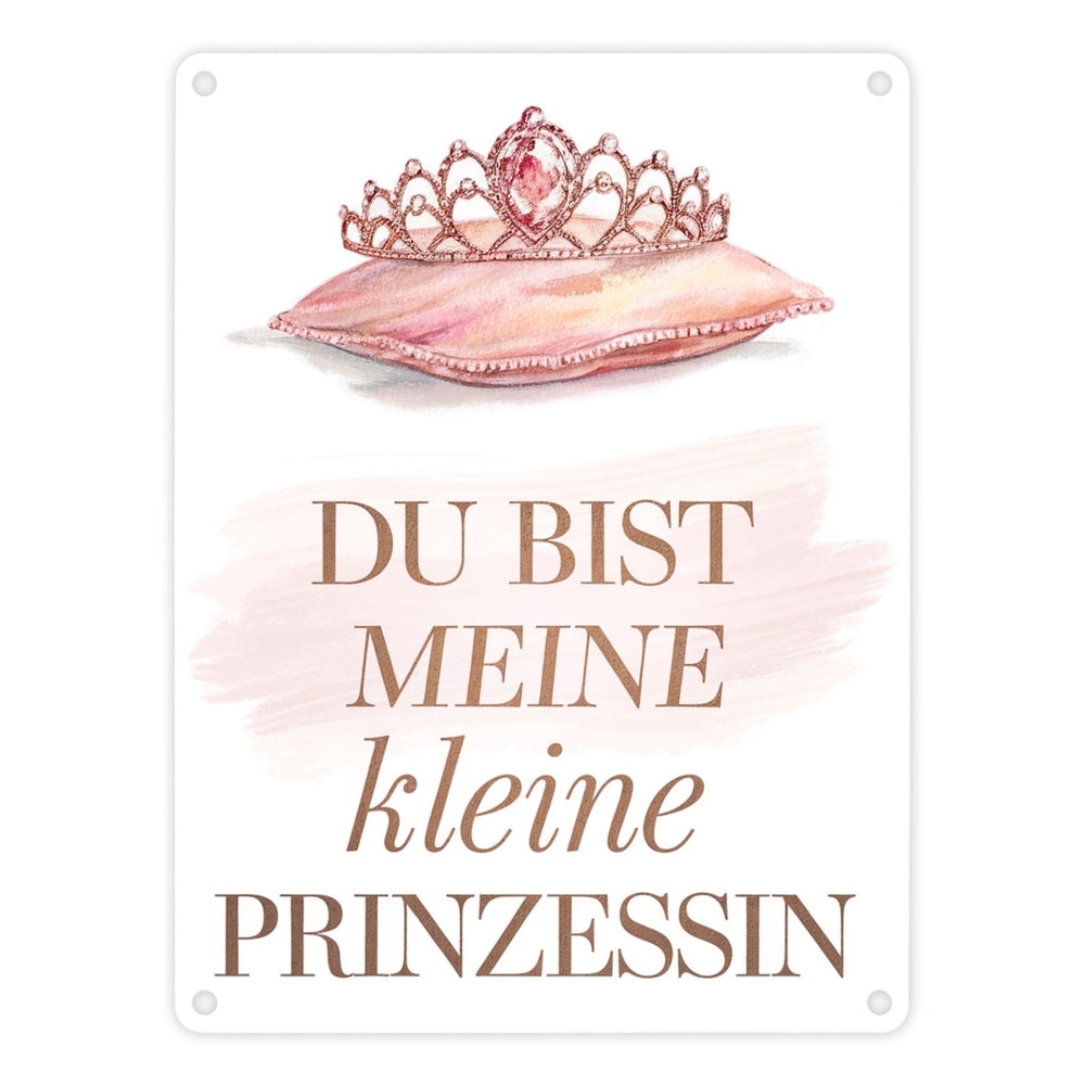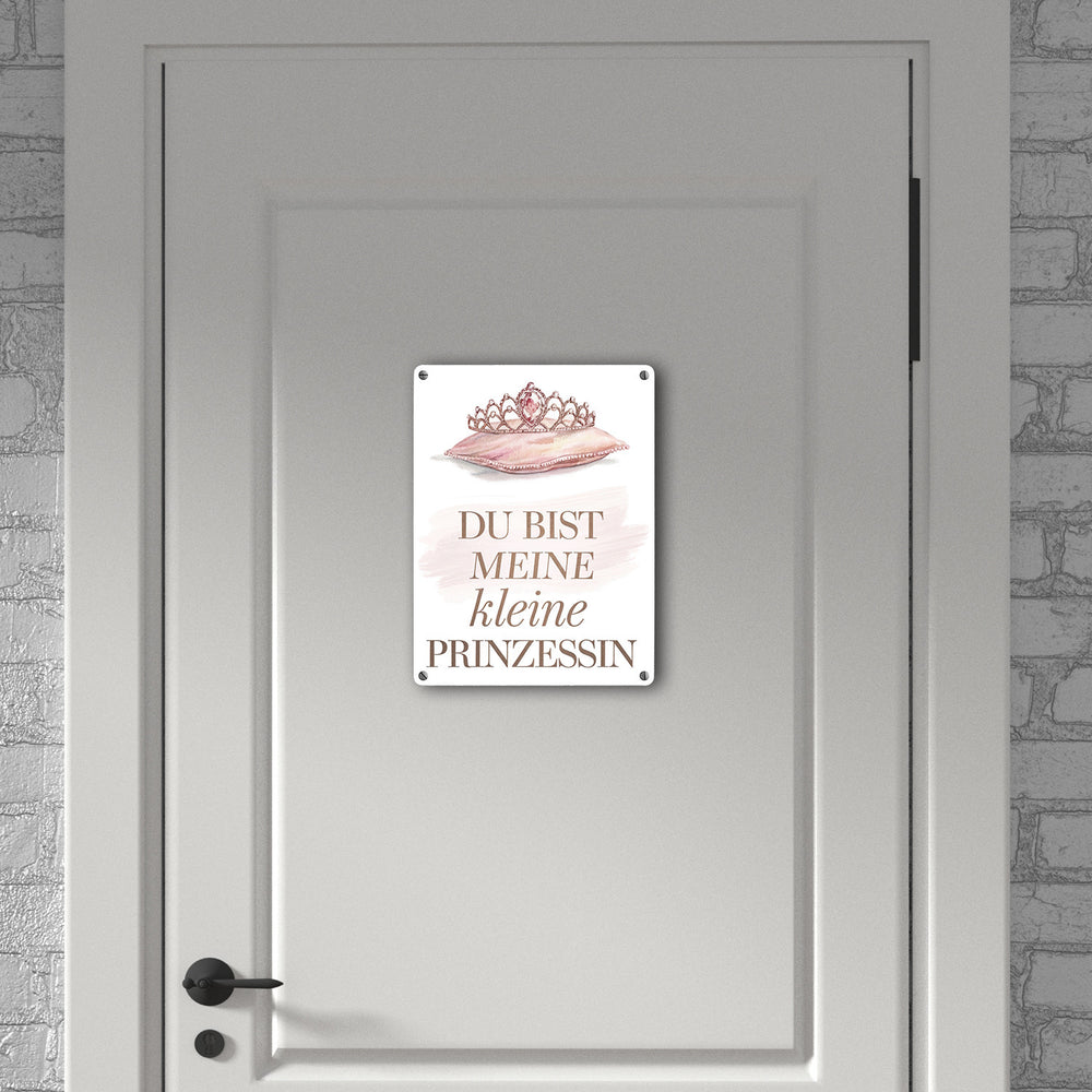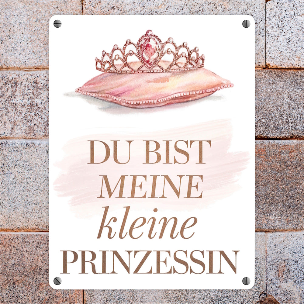 - Dieses bezaubernde Metallschild zeigt eine kunstvoll gestaltete Tiara, geschmückt mit funkelnden Juwelen, die auf einem weichen, pastellrosa Kissen ruht. Der elegante Schriftzug "DU BIST MEINE KLEINE PRINZESSIN" in goldenen und rosa Buchstaben rundet das Design ab und verleiht dem Schild eine liebevolle Note.