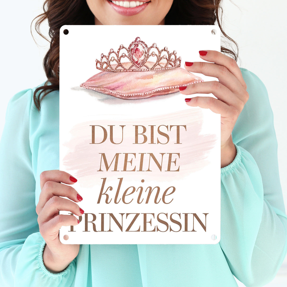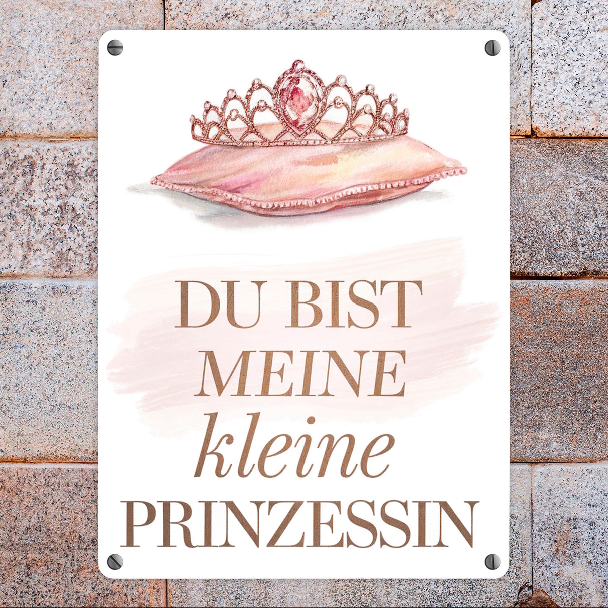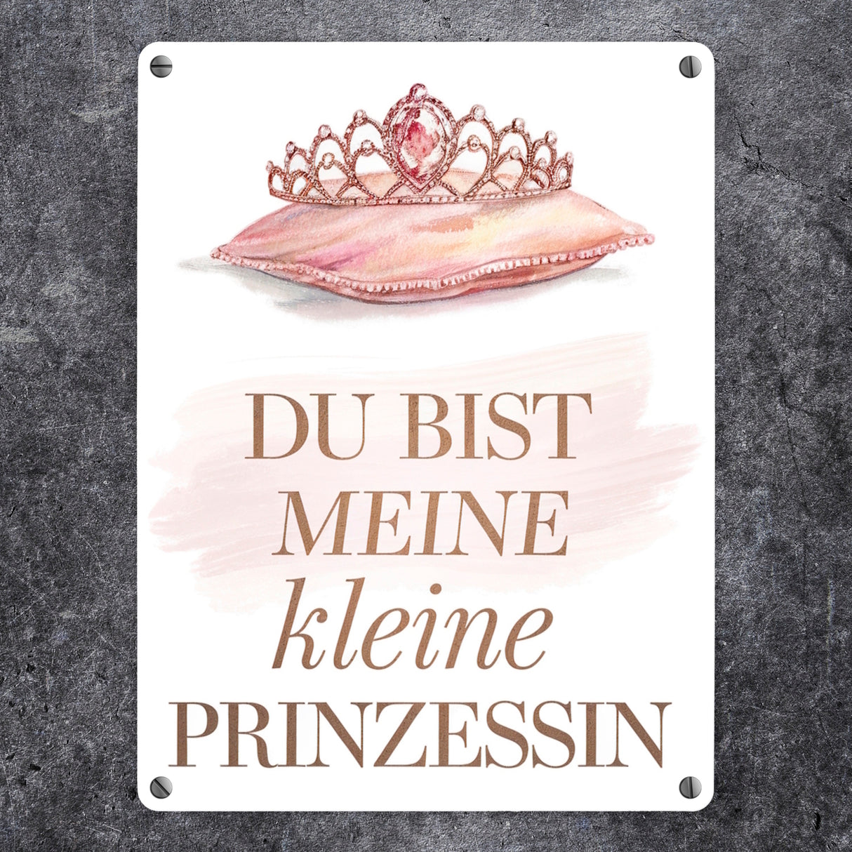 - Dieses bezaubernde Metallschild zeigt eine kunstvoll gestaltete Tiara, geschmückt mit funkelnden Juwelen, die auf einem weichen, pastellrosa Kissen ruht. Der elegante Schriftzug "DU BIST MEINE KLEINE PRINZESSIN" in goldenen und rosa Buchstaben rundet das Design ab und verleiht dem Schild eine liebevolle Note.