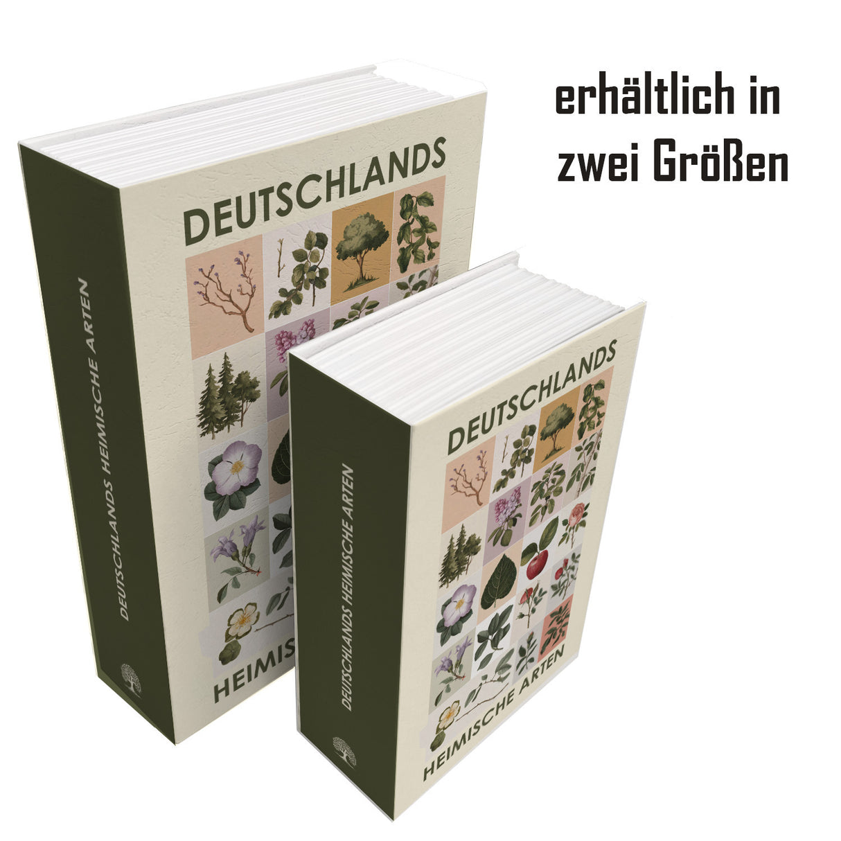 • Dieses clevere Booksafe im botanischen Design besticht durch seinen authentischen Buchumschlag "DEUTSCHLANDS HEIMISCHE ARTEN". Links tummeln sich detaillierte Pflanzenillustrationen von Bäumen bis Blumen, während rechte Textinhalte 2500 hochwertige Illustrationen versprechen. Ein Highlight für jedes Bücherregal, das Kunst und Natur vereint!