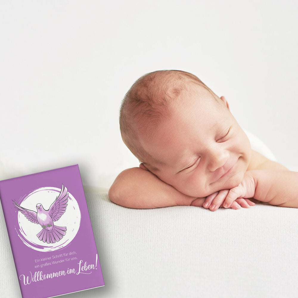 - Mit ausgebreiteten Flügeln schwebt die Taube vor einem zauberhaften lila Hintergrund. Ganz elegant in geschwungener Schrift verkündet sie: "Ein kleiner Schritt für dich, ein großes Wunder für uns. Willkommen im Leben!" Ein weißer Kreis umrahmt das himmlische Motiv und macht es zur perfekten Tauf-Einladung.