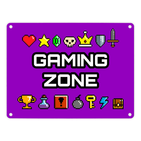 Gaming Zone Metallschild mit Pixel-Items für Zocker in lila