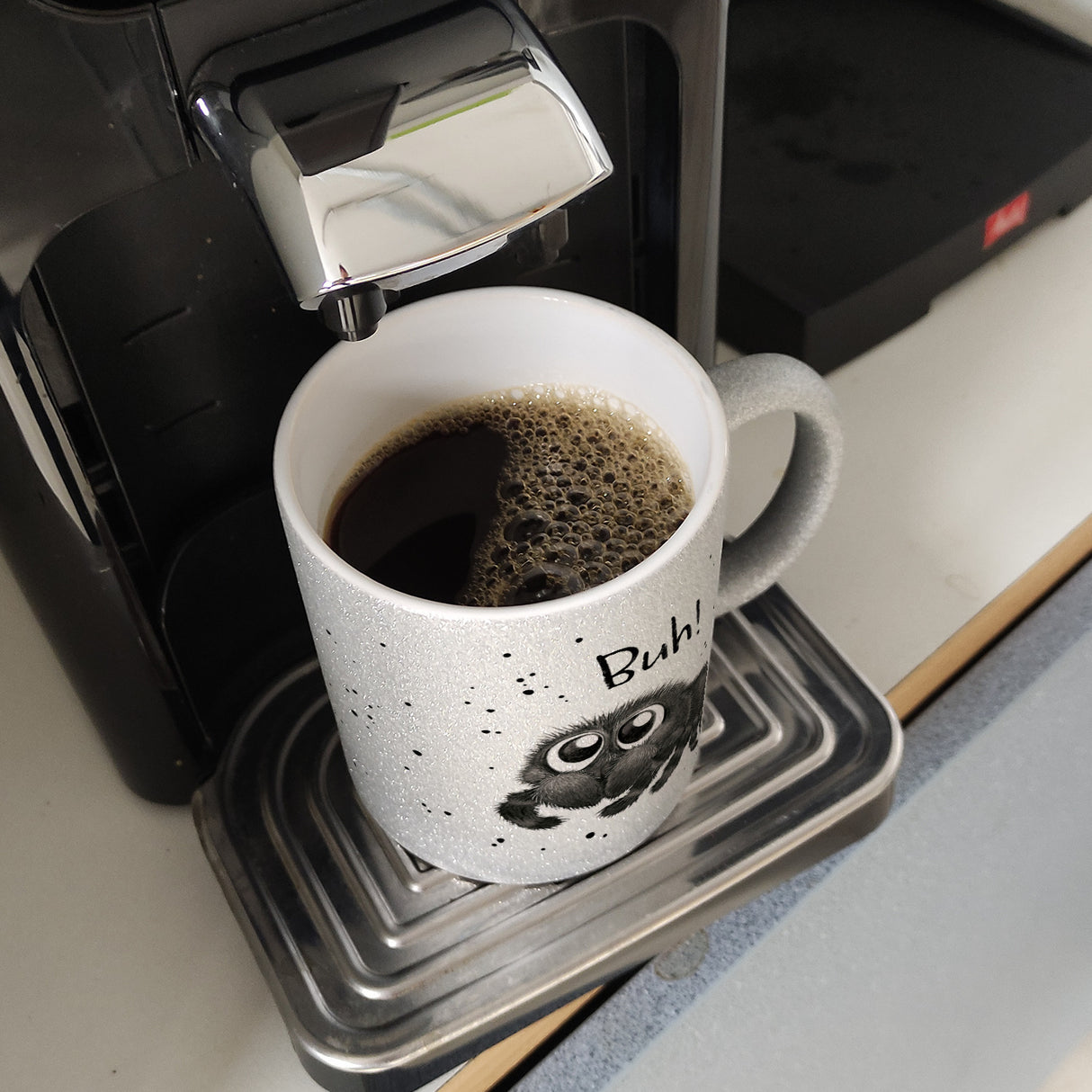 - Der Kaffeebecher mit flauschiger Spinne ist eine niedliche Mischung aus Grusel und Süße. Die großen Glubschaugen der Spinne lassen dich schmunzeln, während du deinen Kaffee schlürfst. Ideal für alle, die ihren Morgenkaffee mit einer Prise Humor genießen möchten. Ob Tee, Kaffee oder heiße Schokolade, aus diesem Becher schmeckt es einfach besser!