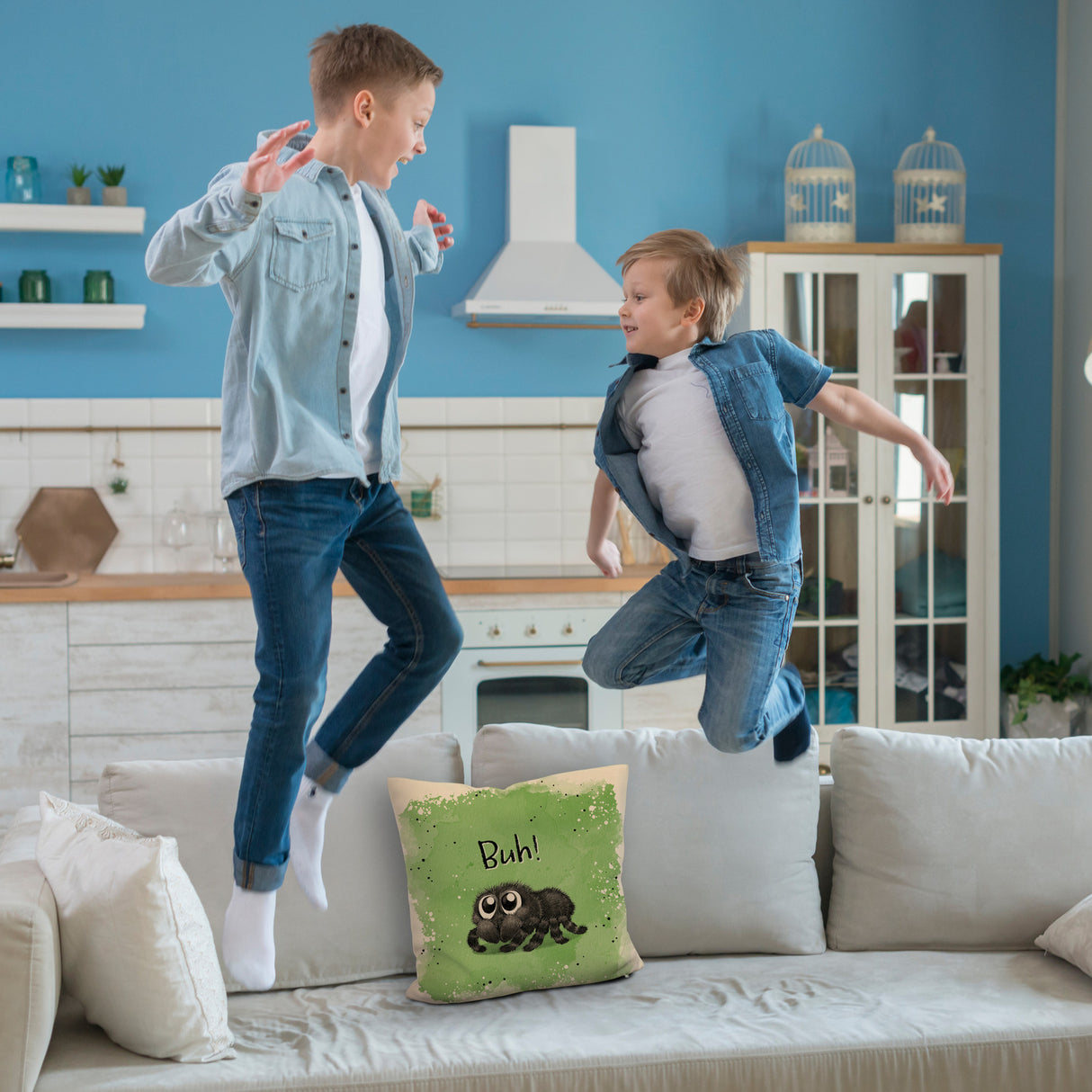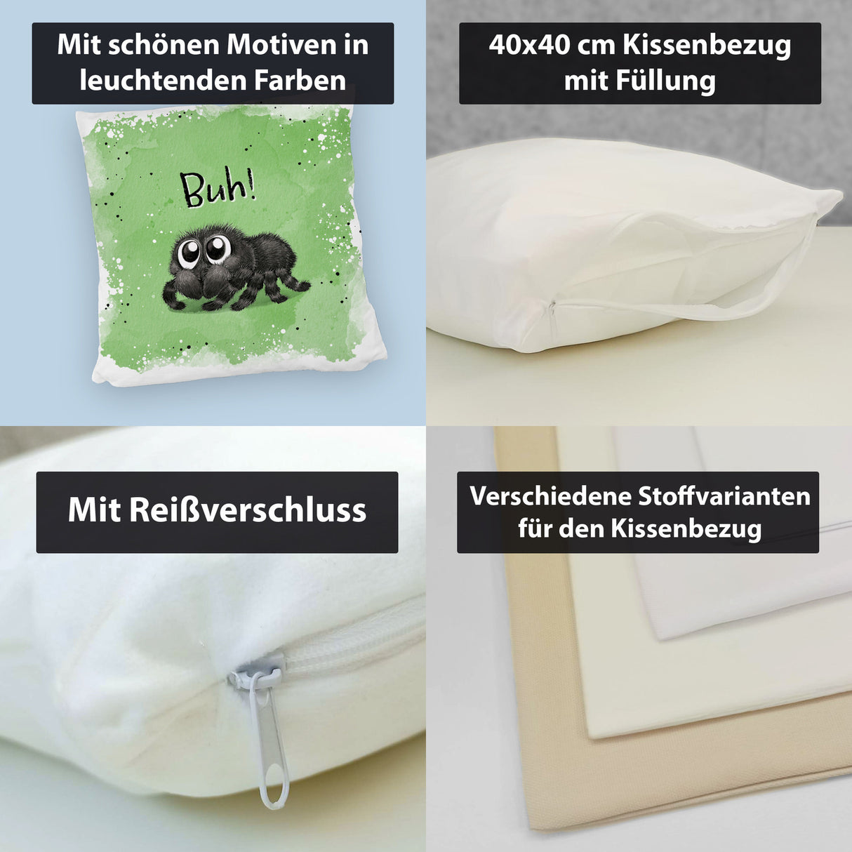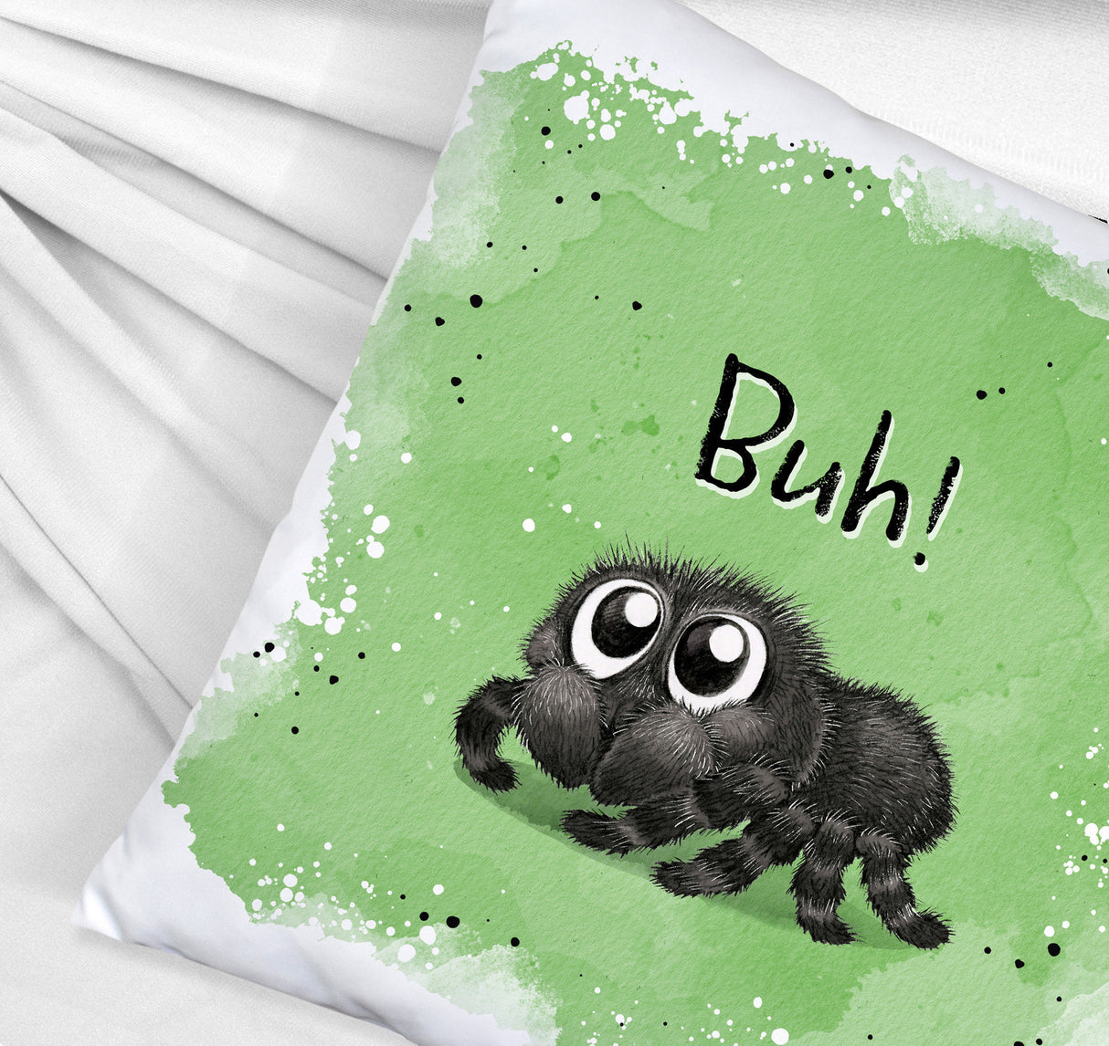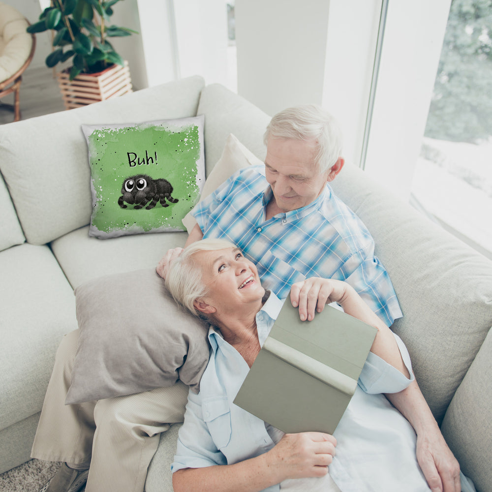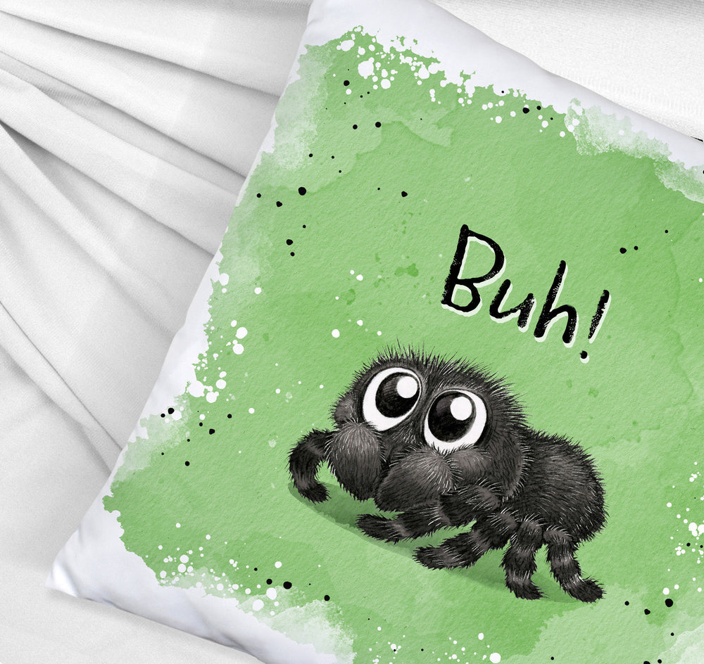 - Das Kissen mit dem flauschigen Spinnenmotiv ist der absolute Hingucker! Es zeigt eine knuffige Spinne mit riesigen Glubschaugen, die garantiert jedem ein Lächeln ins Gesicht zaubert. Perfekt für alle, die es gruselig-süß mögen und ihr Sofa zu Halloween aufpeppen wollen. Es ist in vier verschiedenen Oberflächen erhältlich, von kuschelig bis satiniert.