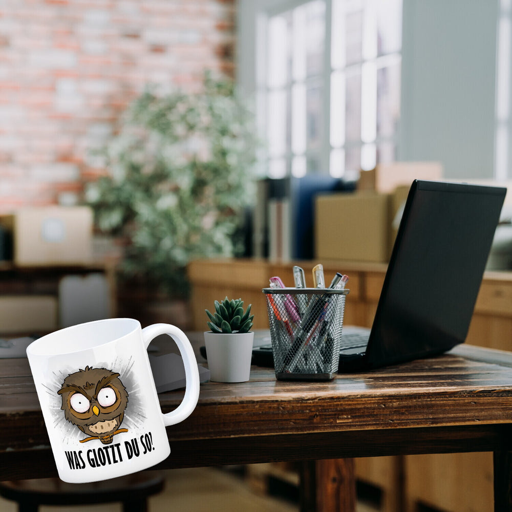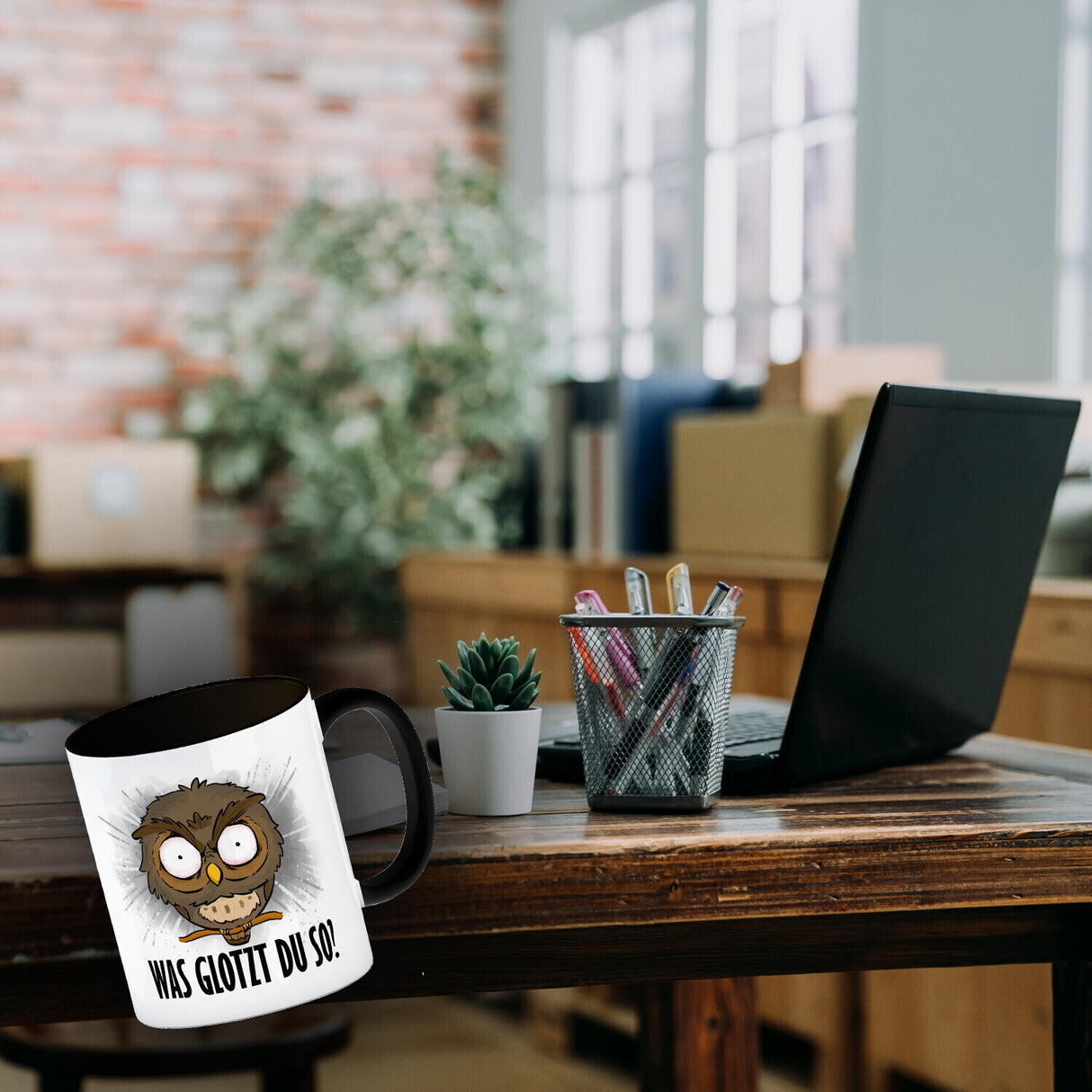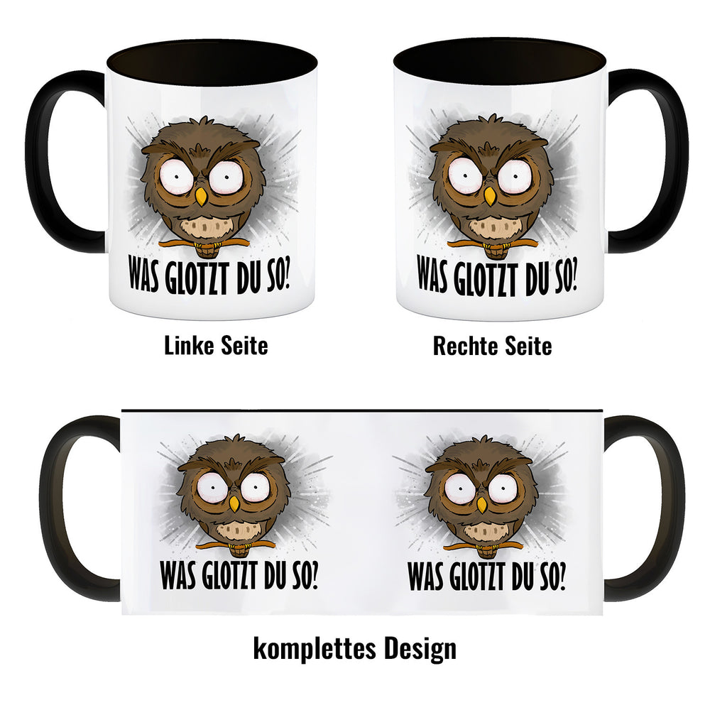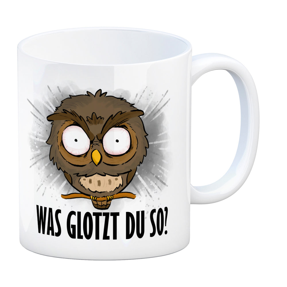 Eule Kaffeebecher mit Spruch Was glotzt du so?