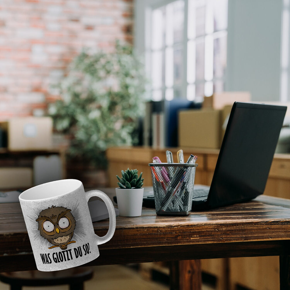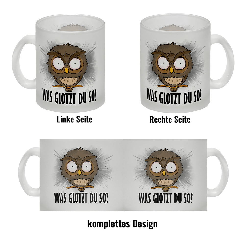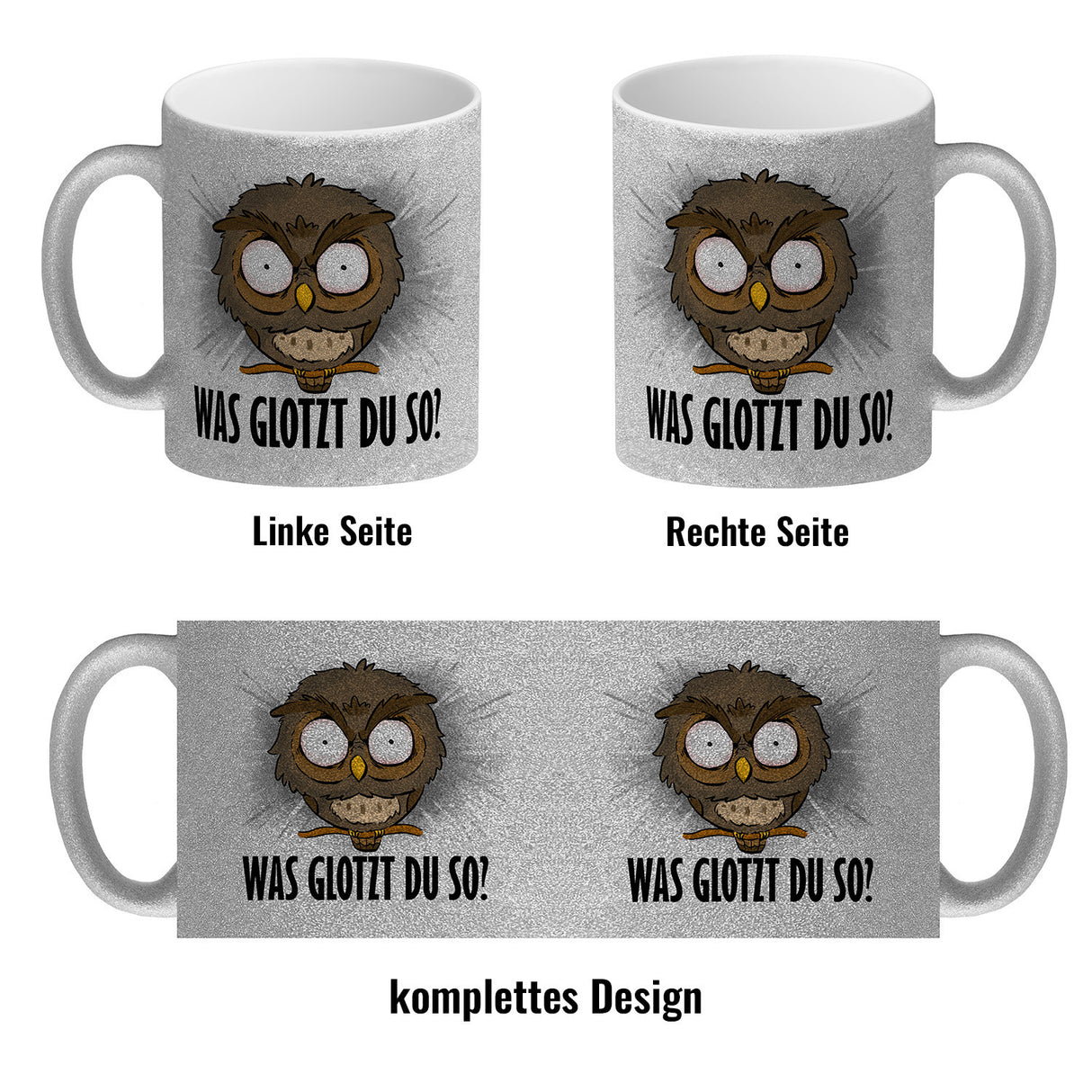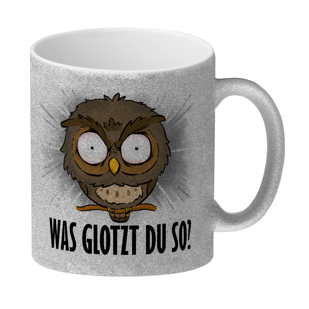 Eule Kaffeebecher mit Spruch Was glotzt du so?