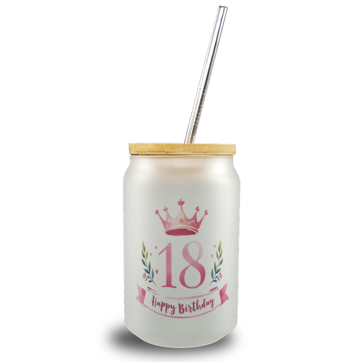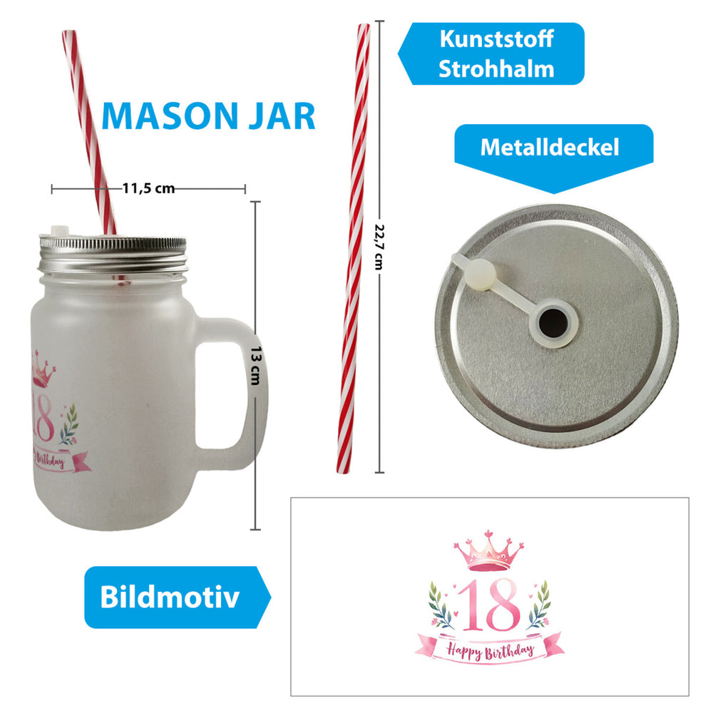 - 1x Happy Birthday 18 Krone Trinkglas mit Bambusdeckel mit Bambusdeckel oder Henkel