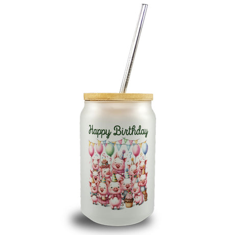 Schweine Party Trinkglas mit Bambusdeckel mit Spruch Happy Birthday