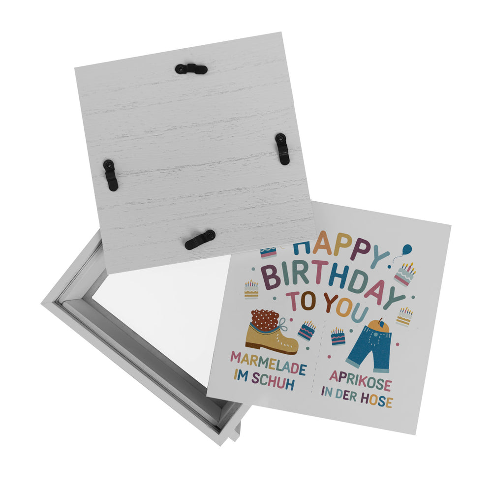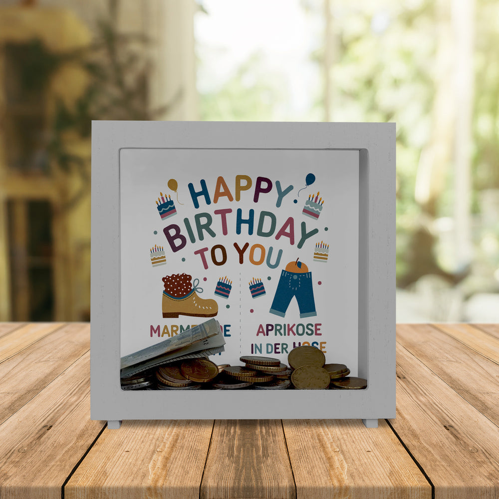 Die Happy Birthday to you Marmelade im Schuh Spardose ist der perfekte Mix aus Humor und Funktionalität – das Geschenk, das keinen Geburtstag unvergessen lässt! Egal, ob für die schrullige Tante, den besten Freund oder Ihr Lieblingskind, diese Spardose verwandelt jedes Geburtstagsfest in ein Erlebnis voller Lächeln und Gelächter.Erhältlich in drei besonderen Ausführungen – als zeitlose Holzspardose, elegante ovale Keramik-Version oder raffinierte Holzrahmen-Variante mit Sichtfenster – bietet sie für jeden Geschmack das Richtige. Jede Spardose wird liebevoll in unserer deutschen Manufaktur bedruckt, um höchste Qualität zu garantieren.Doch diese Spardose ist mehr als ein Platz für Kleingeld. Überreichen Sie sie mit ein paar Münzen oder einem Schein, damit das Geburtstagskind gleich auf seine Träume sparen kann. Oder nutzen Sie sie als humorvolles Deko-Element auf der Party, das Erinnerungen an unbeschwerte Kindheitstage weckt. So bringen Sie einen Hauch deutscher Geburtstagskultur und eine ordentliche Portion Spaß in jede Feier.Für alle, die eine Prise Nostalgie und eine große Portion Humor verschenken möchten: Diese Spardose ist ein Muss. Lachen ist die beste Medizin – und diese Spardose sorgt nicht nur für ein gesundes Herz, sondern auch für volle Taschen!