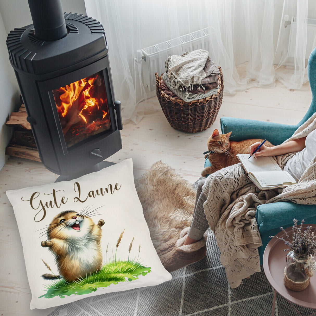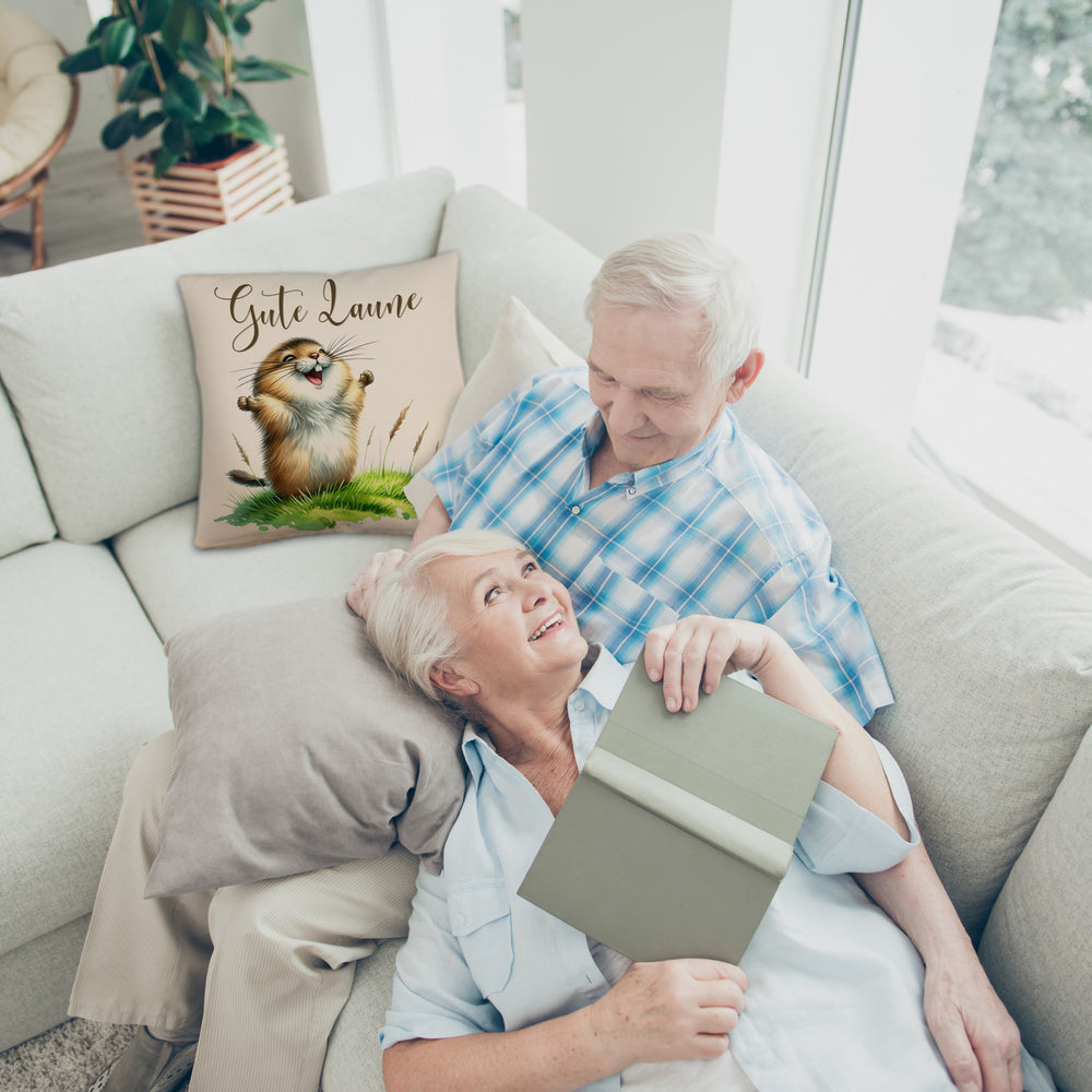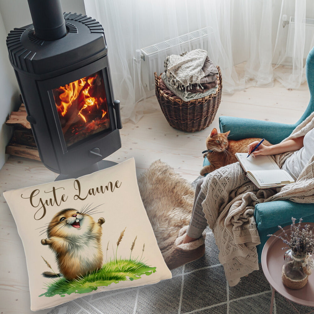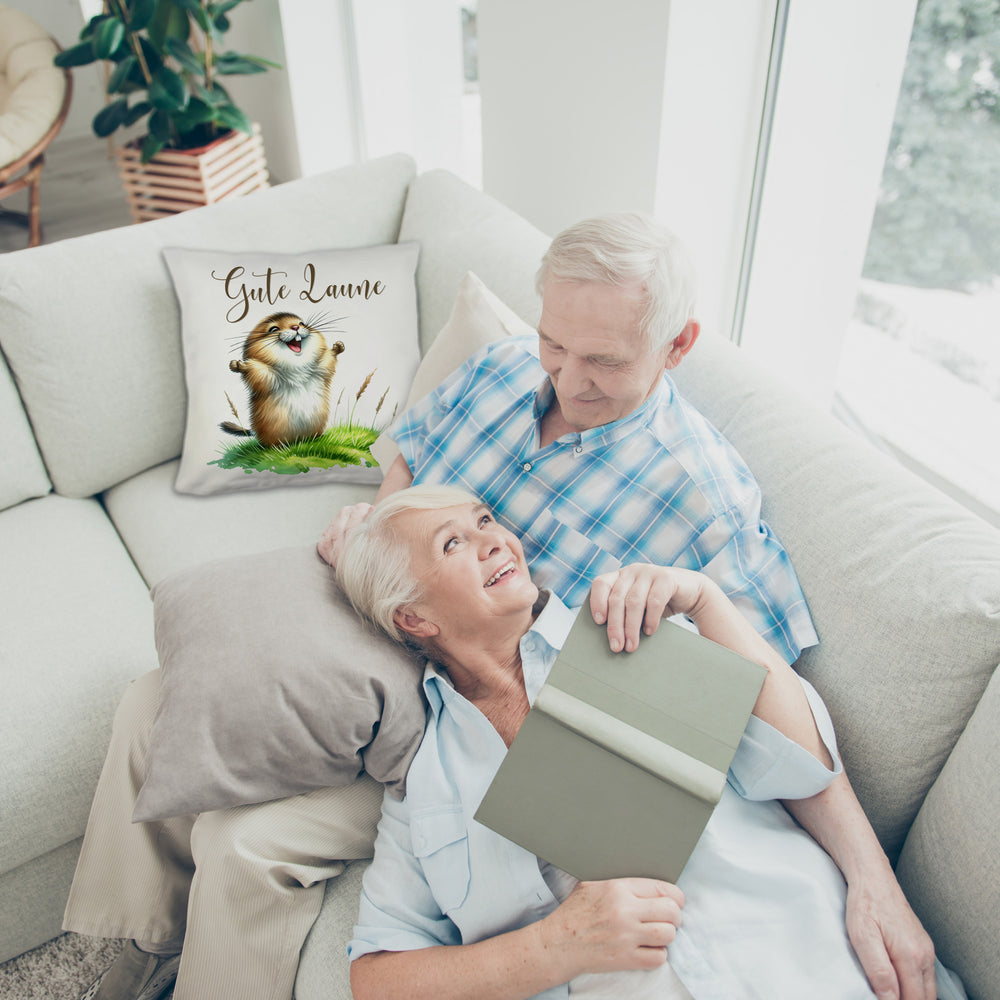 jubelnder Lemming Kissen mit Spruch Gute Laune
