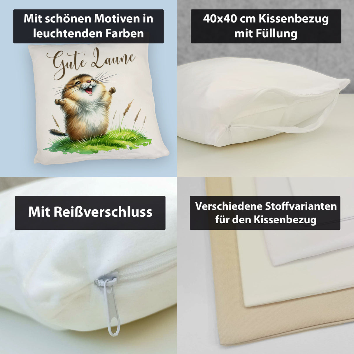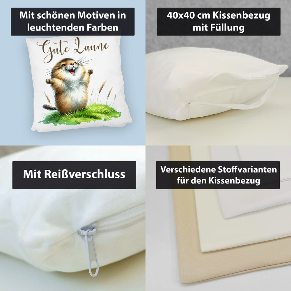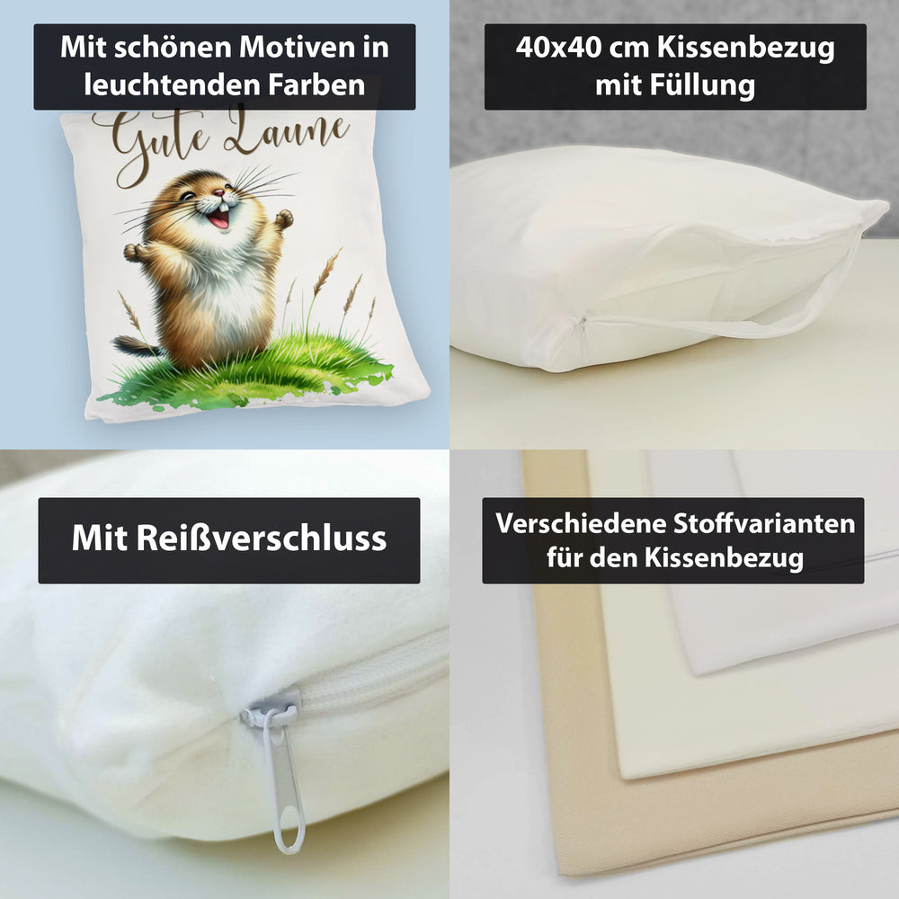 - 1x jubelnder Lemming Kissen mit Spruch Gute Laune in der gewählten Ausführung