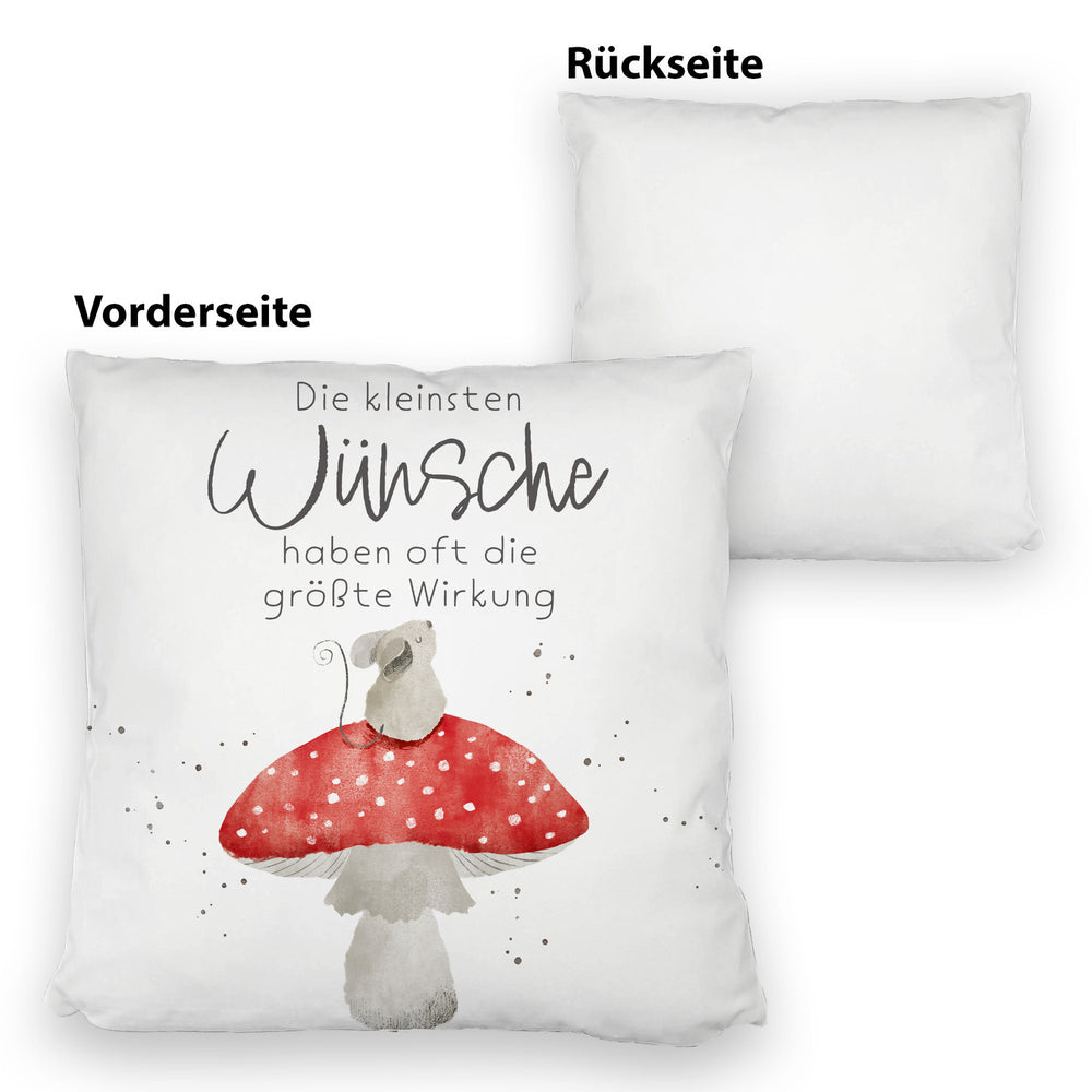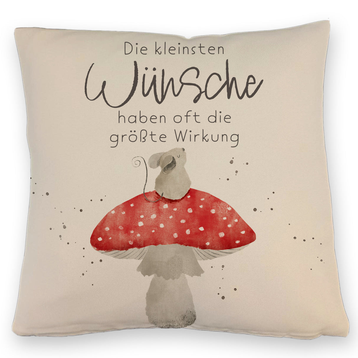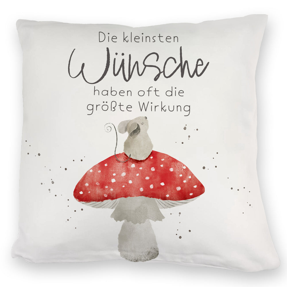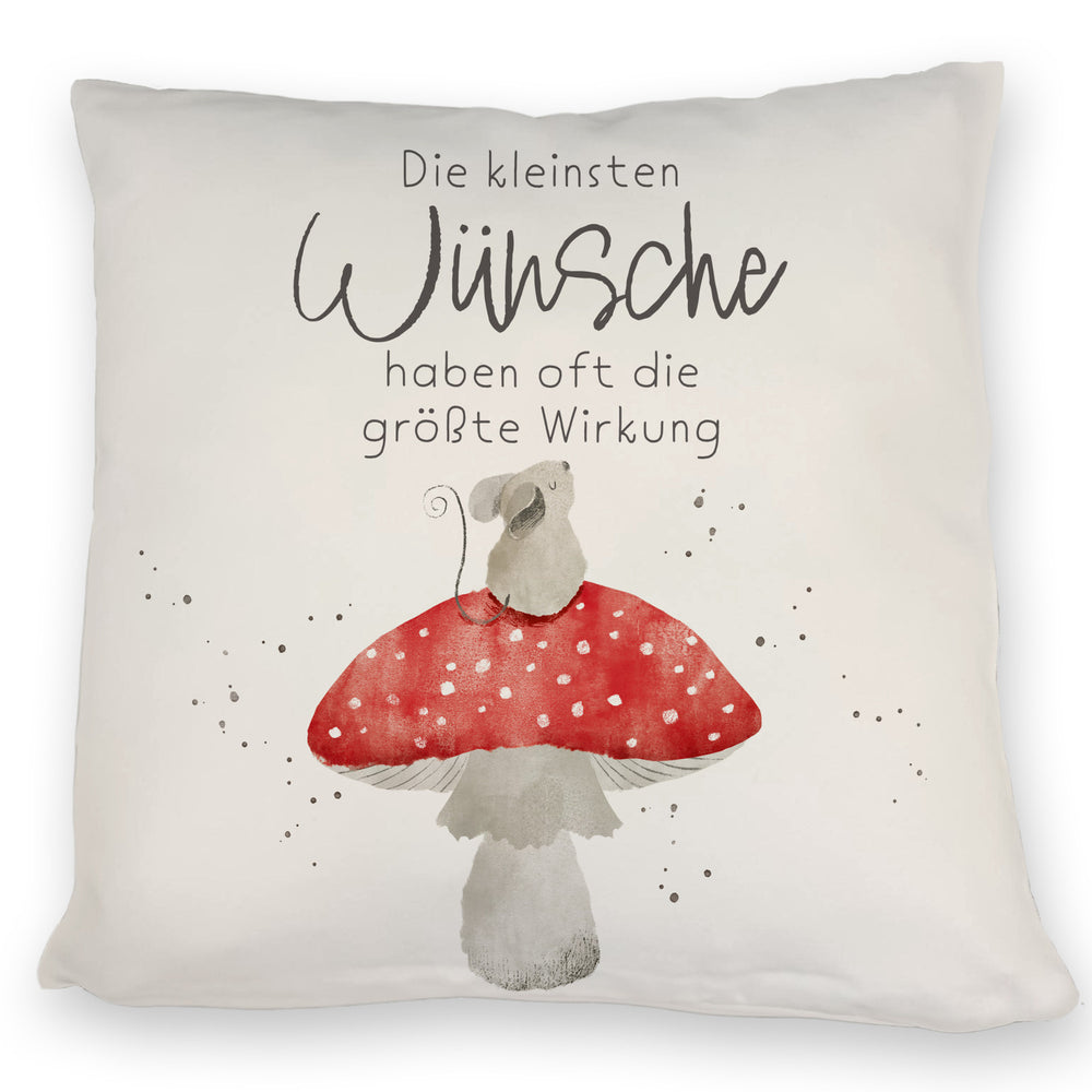 Maus auf Fliegenpilz Kissen mit Spruch Kleinste Wünsche größte Wirkung