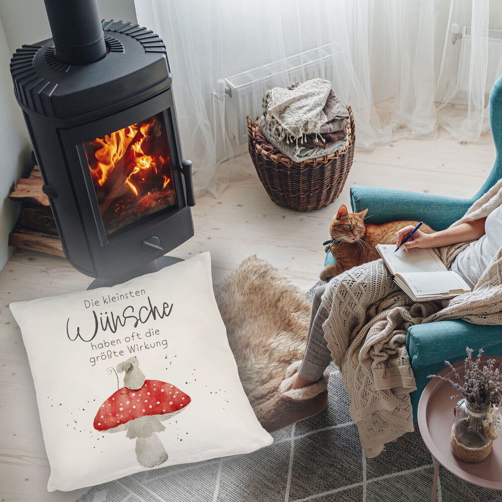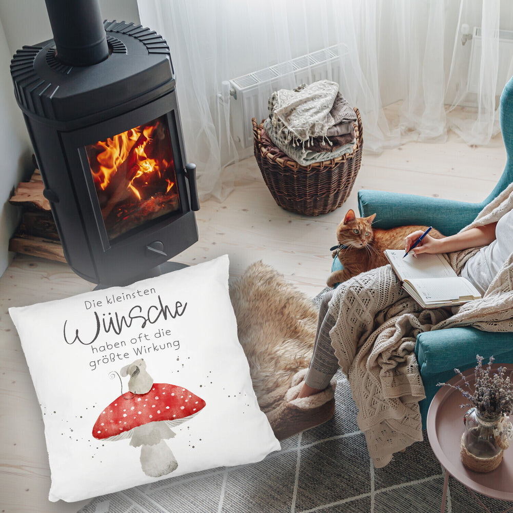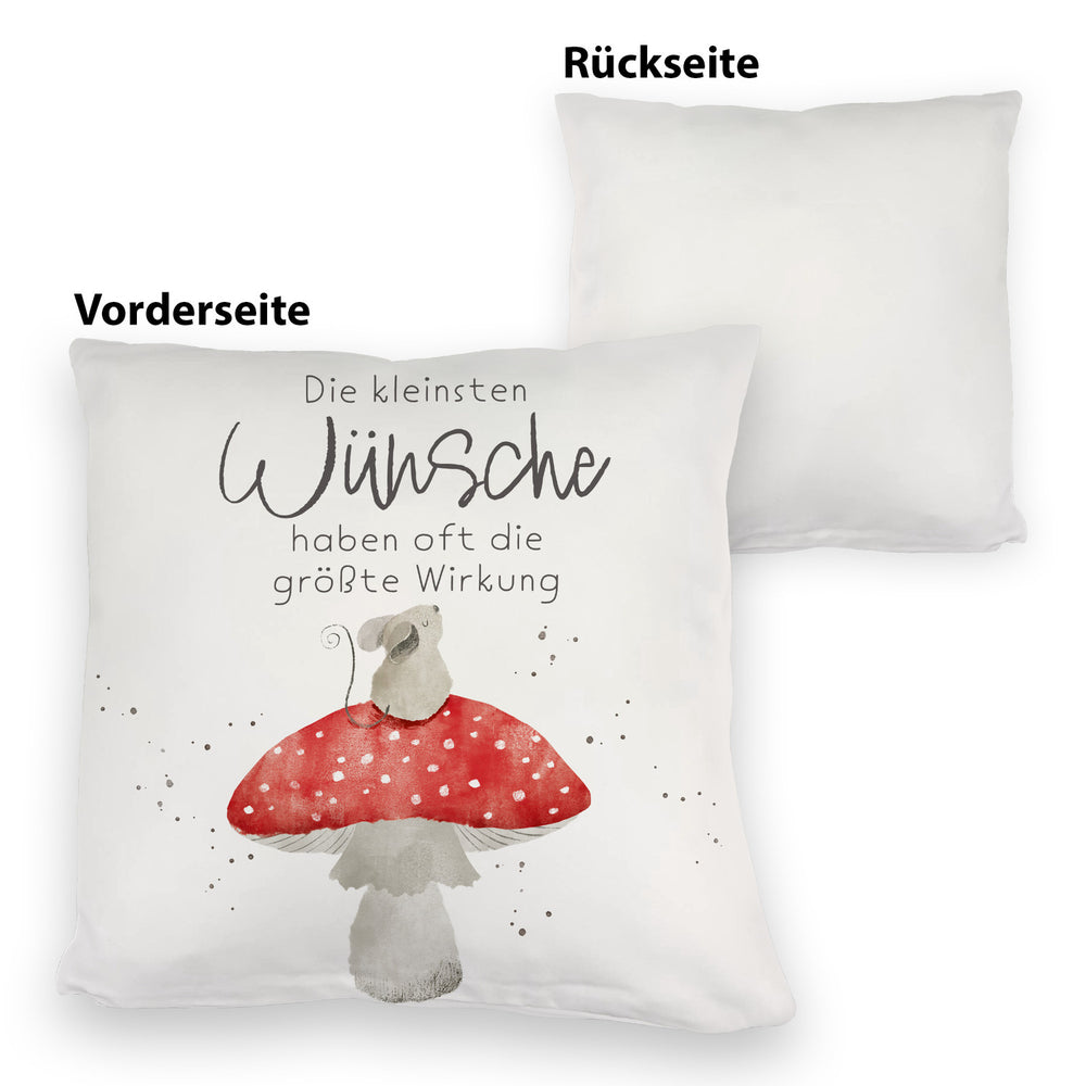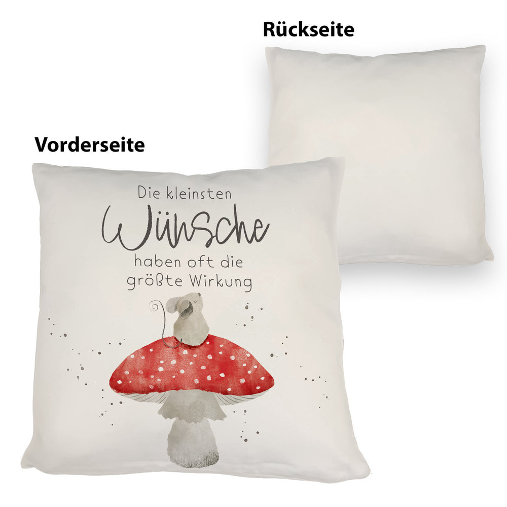 Maus auf Fliegenpilz Kissen mit Spruch Kleinste Wünsche größte Wirkung