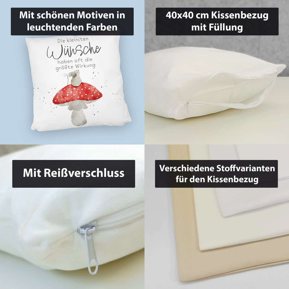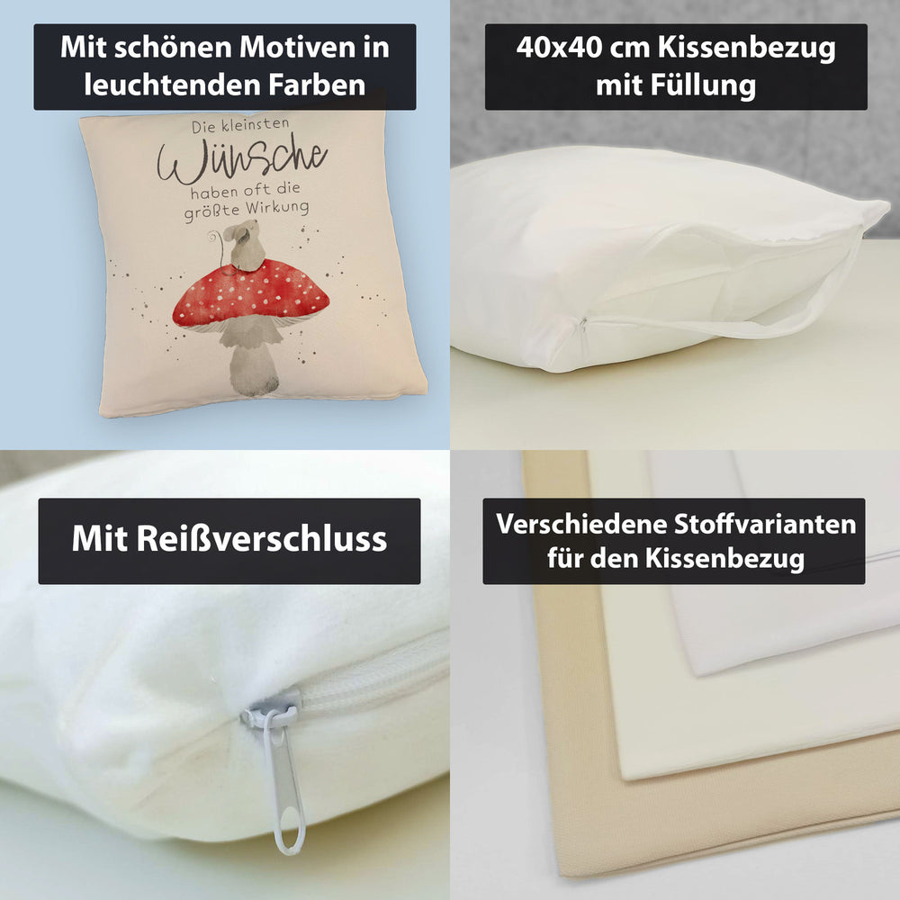 • 1x Maus auf Fliegenpilz Kissen mit Spruch Kleinste Wünsche größte Wirkung in der gewählten Ausführung