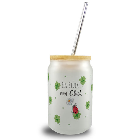 Marienkäfer Trinkglas mit Bambusdeckel mit Spruch Ein Stück vom Glück