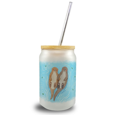 Otter mit Kaffeetasse Trinkglas mit Bambusdeckel im Aquarell-Stil
