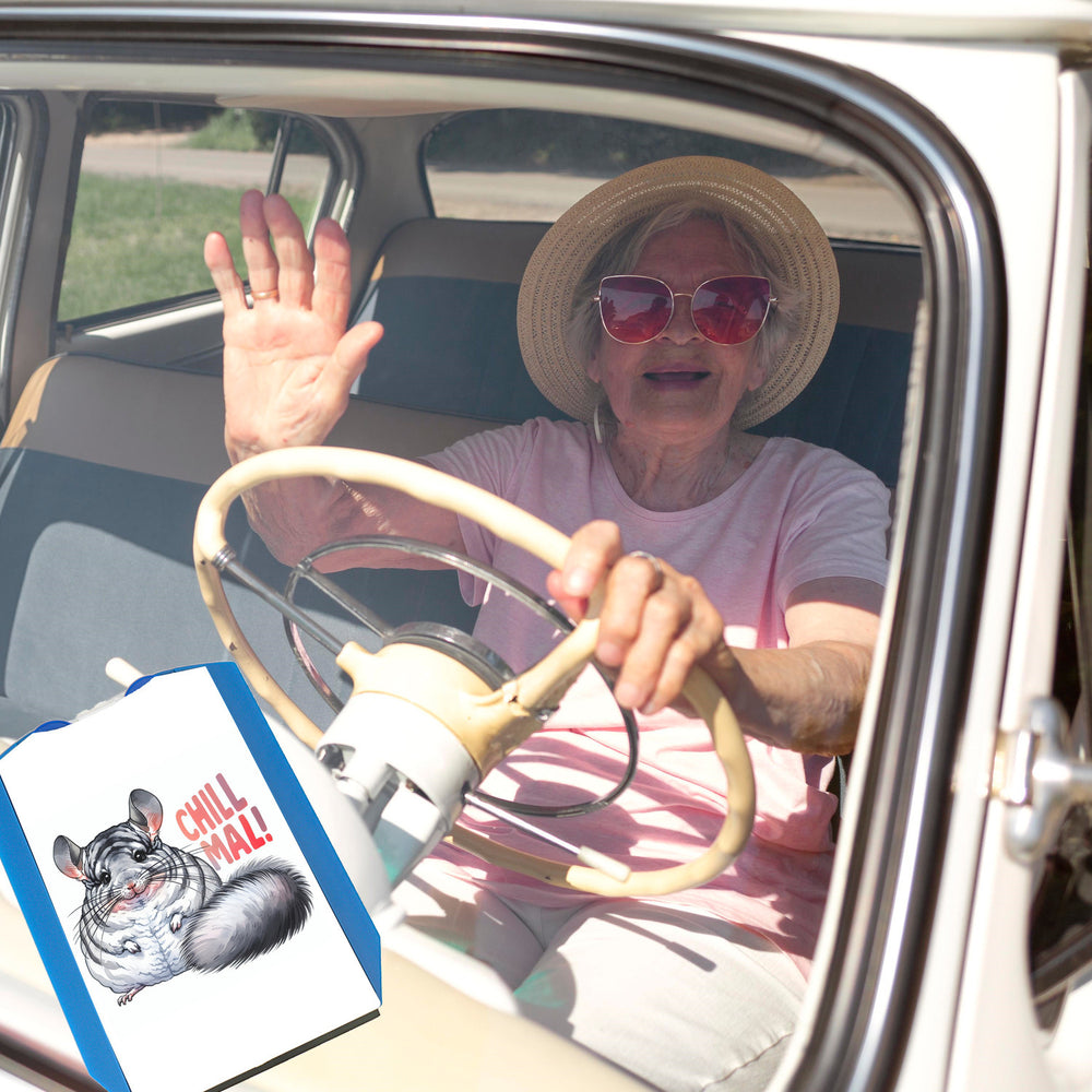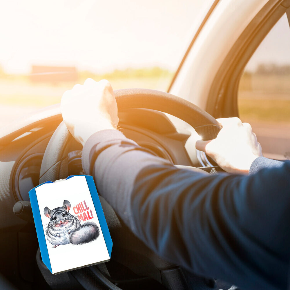- Diese herzige Parkscheibe bringt Freude ins Auto: Ein pummeliges, graues Chinchilla sitzt entspannt und erinnert dich verspielt daran, „Chill mal!“ zu machen.
