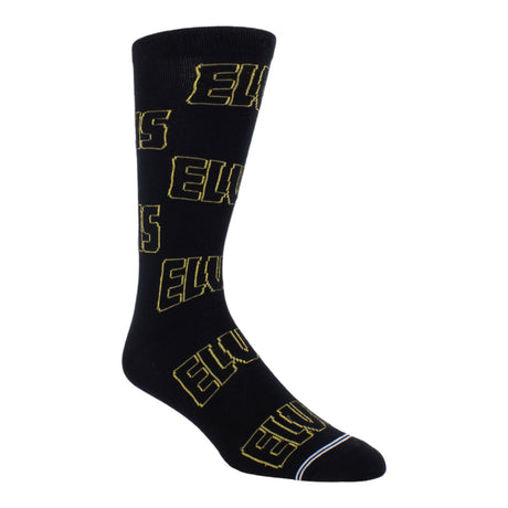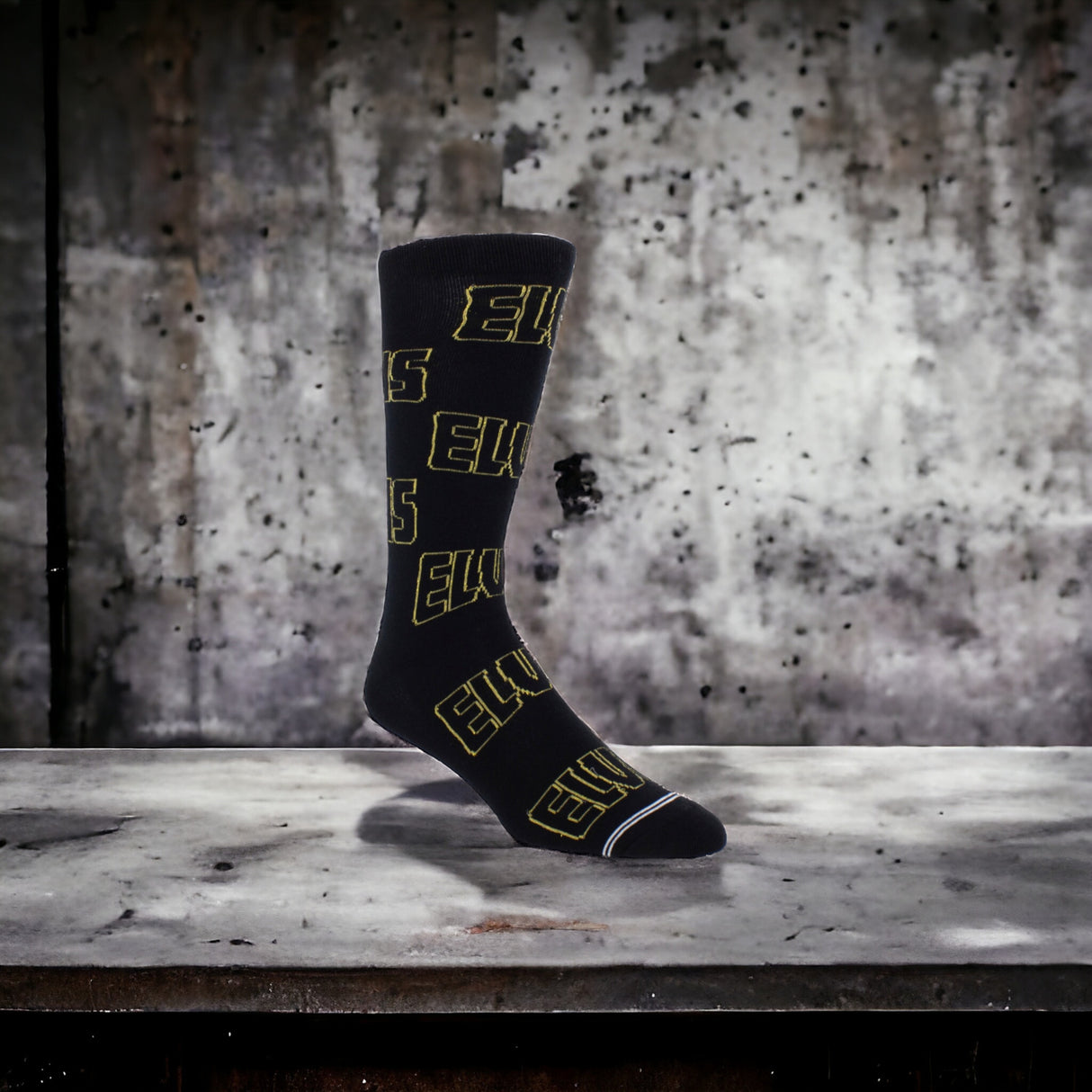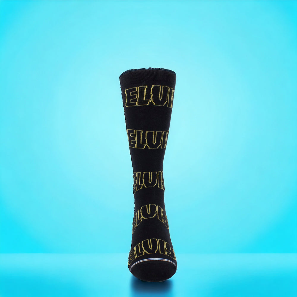 - Mit diesen schwarzen, schillernden Socken trittst du stilvoll in Elvis' Fußstapfen. Der goldfarbene, glitzernde "ELVIS" Schriftzug lässt die Füße im Takt der Musik schwingen. Geliefert in einer schicken Geschenkbox, sind sie das perfekte Accessoire für deine Blue Suede Shoes!