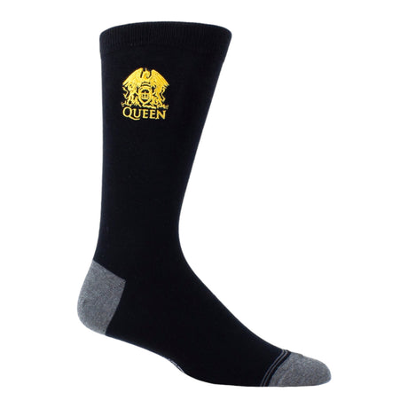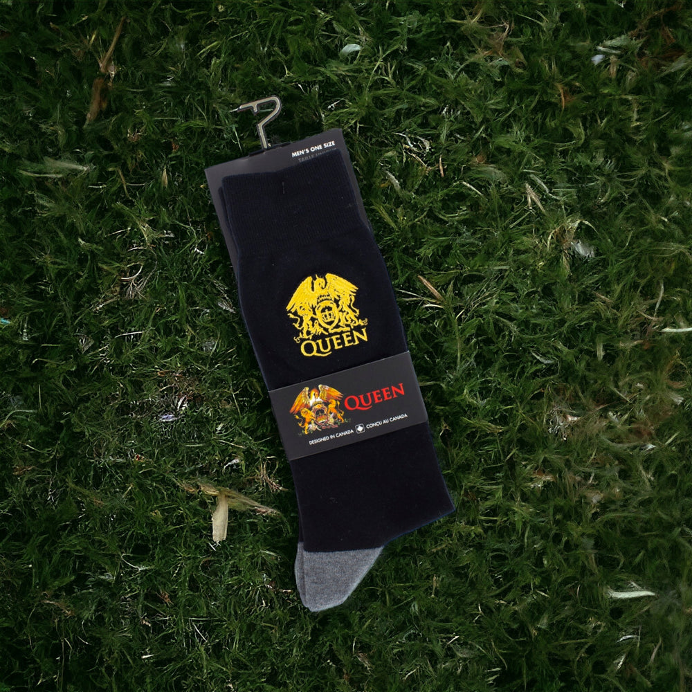 - Diese schicken Socken rocken jedes Outfit! Mit schwarzem Hauptton, stilvollen grauen Hacken und Zehen, gekrönt vom legendären Queen-Logo in glänzendem Goldfaden – sie sind nicht nur Kleidung, sie sind ein Statement für deinen exzellenten Musikgeschmack.