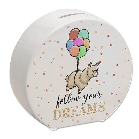 Spardose mit niedlichem Lama-Motiv und Spruch - Follow your dreams