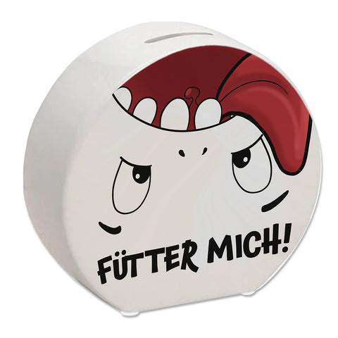 Spardose mit Comicfigur und lustigem Spruch - Fütter mich!