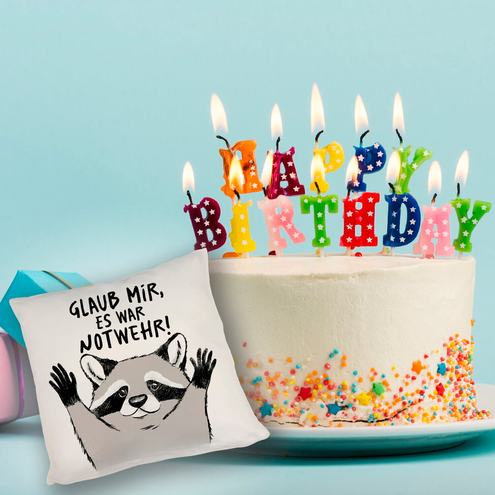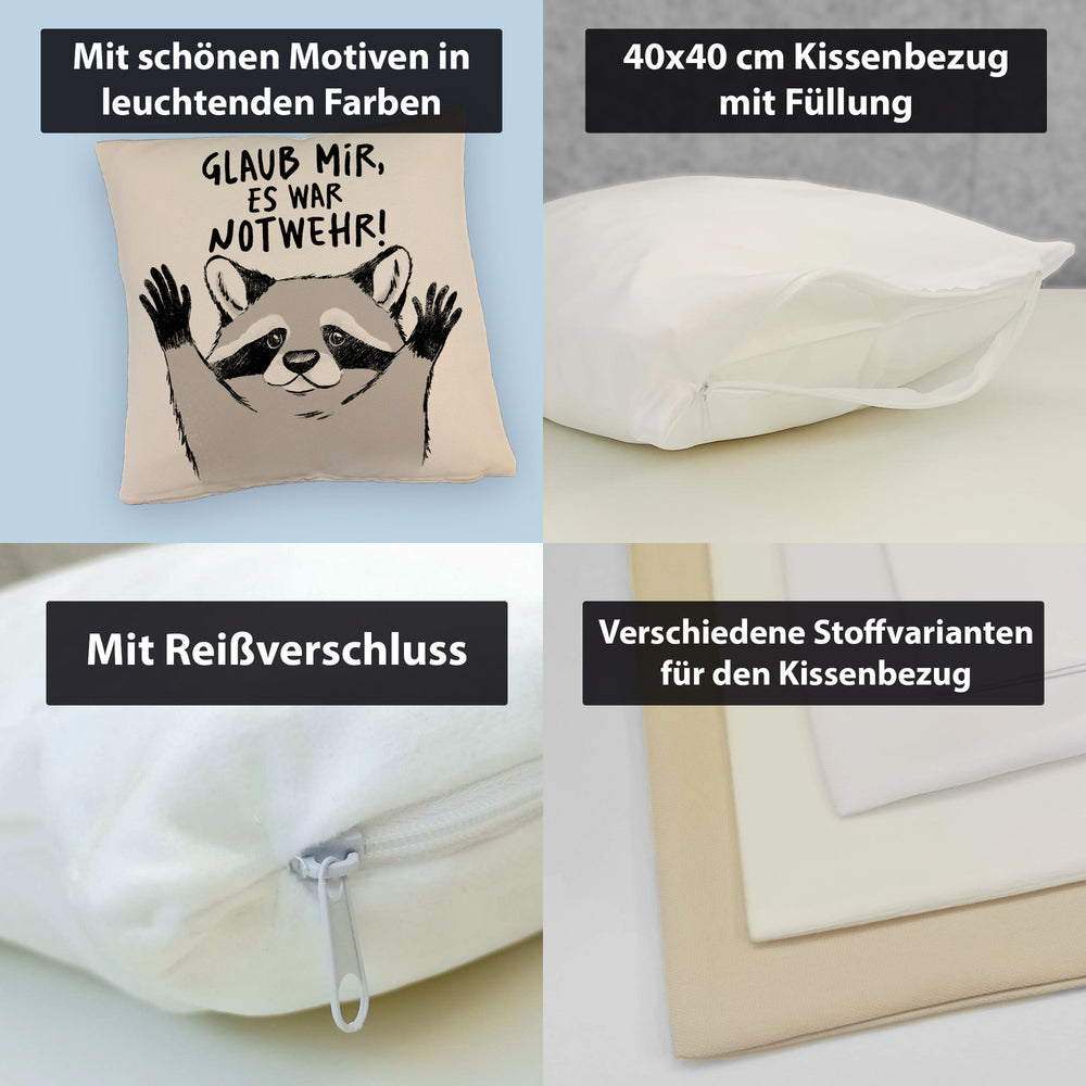 - 1x Waschbär Kissen mit Spruch Glaub mir es war Notwehr in der gewählten Ausführung