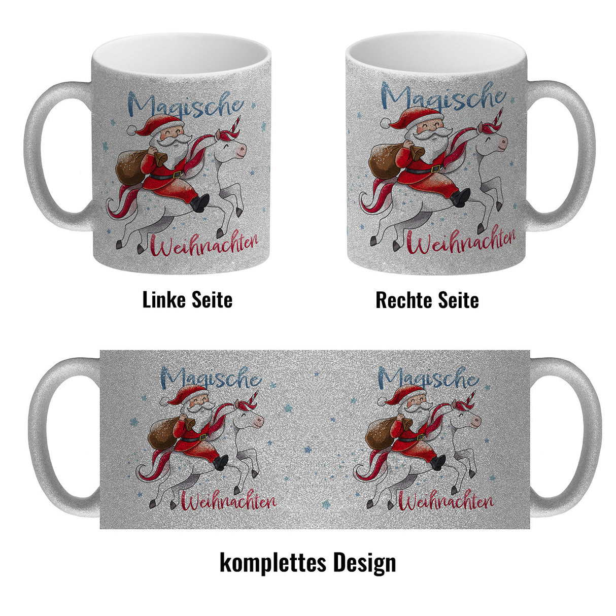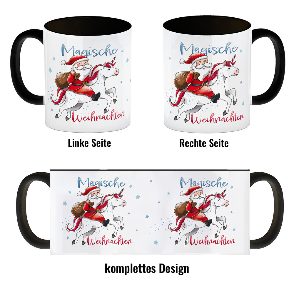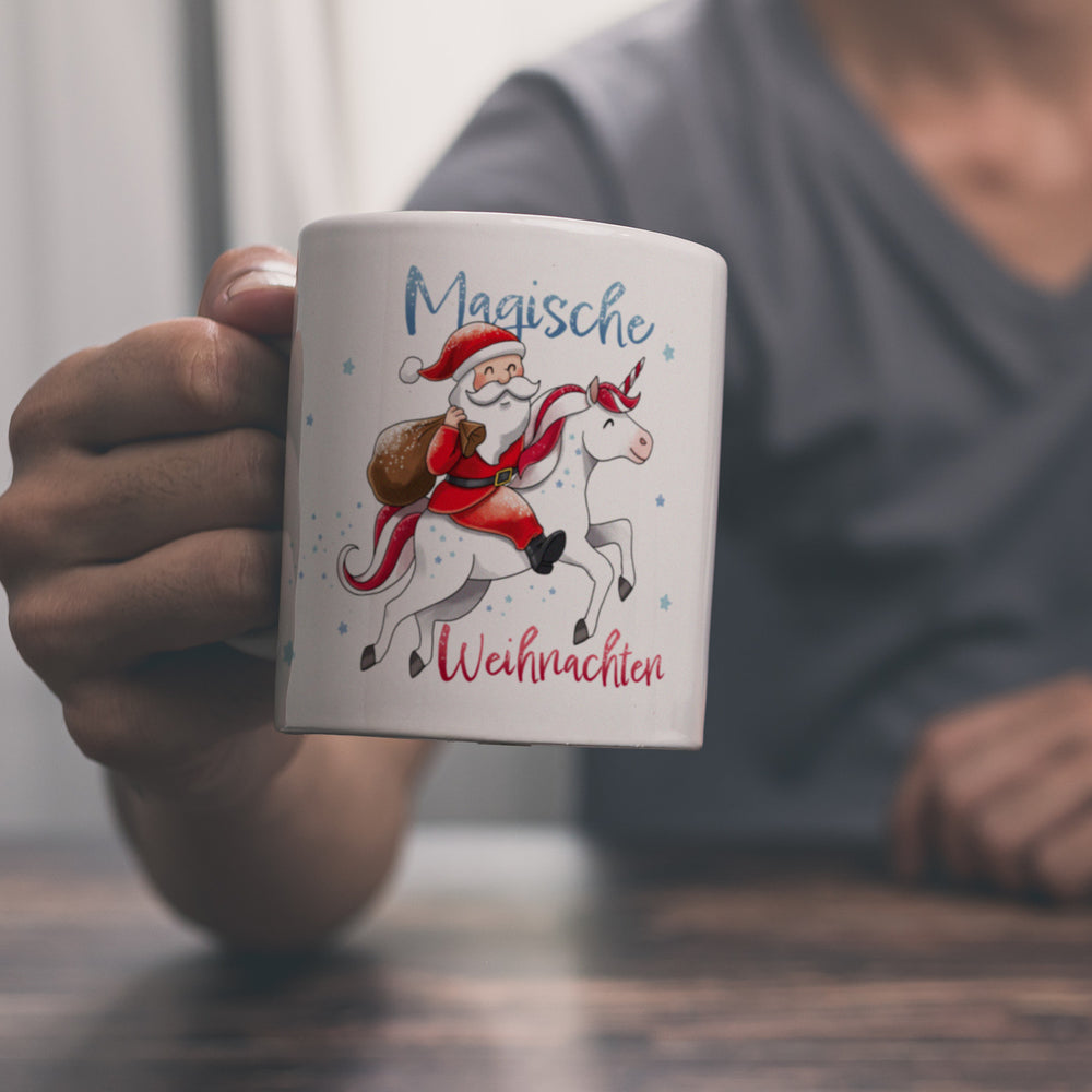 - 1x Weihnachtsmann auf Einhorn Kaffeebecher mit Spruch Magische Weihnachten in der gewählten Ausführung