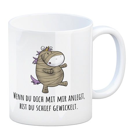 Einhorn-Mumie Kaffeebecher mit Spruch Du bist doch schief gewickelt