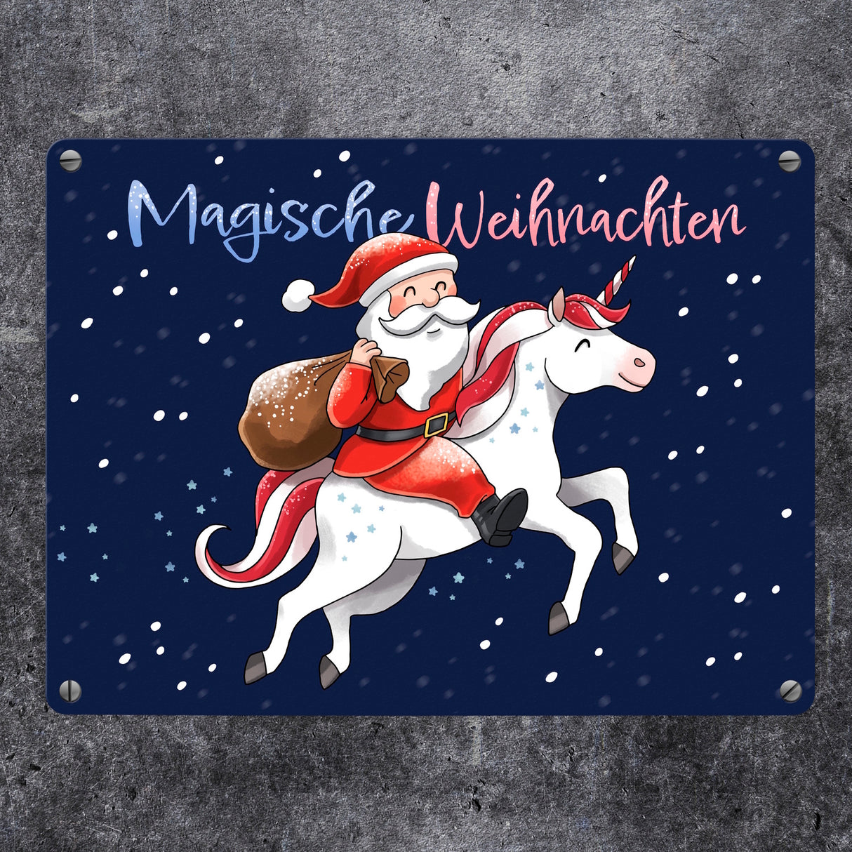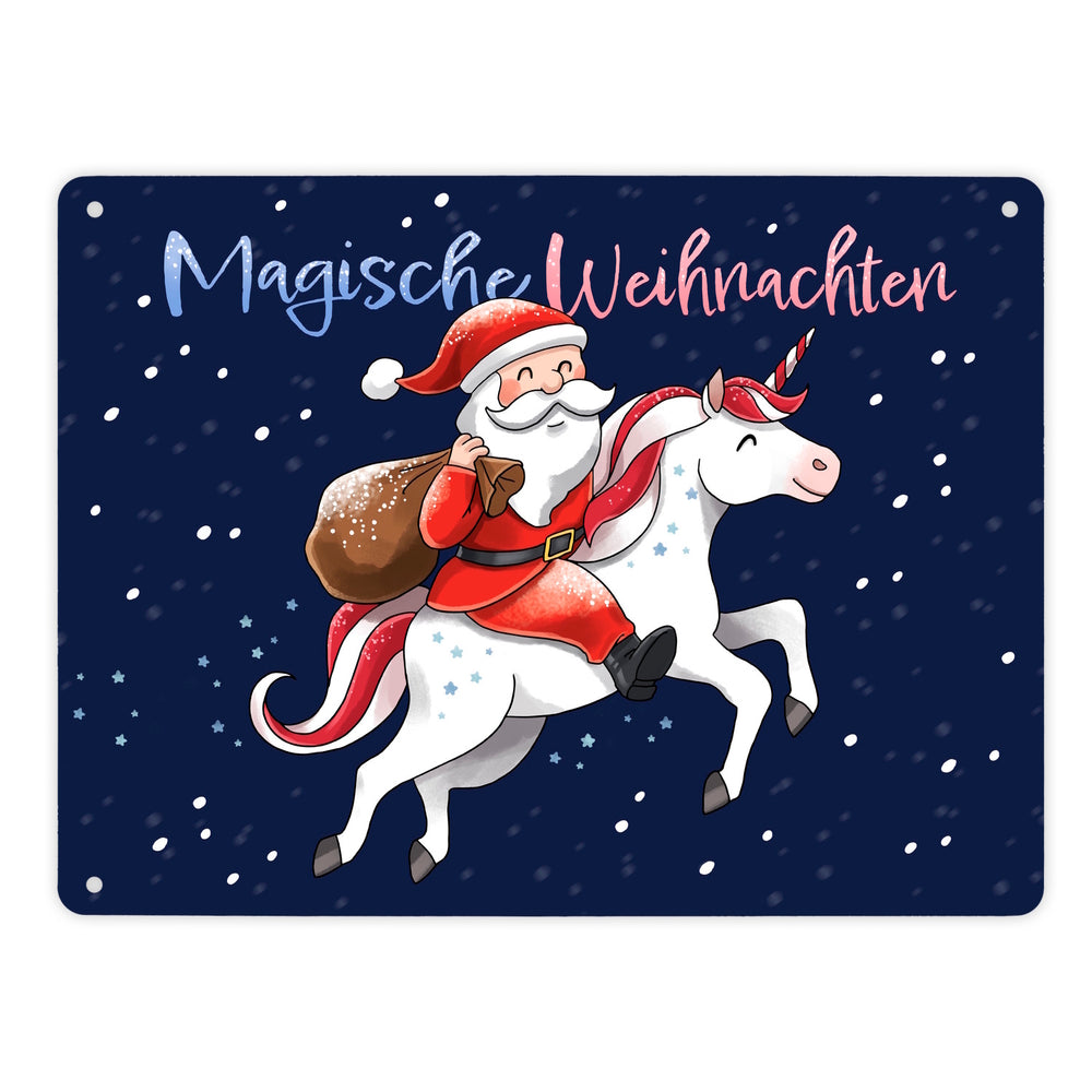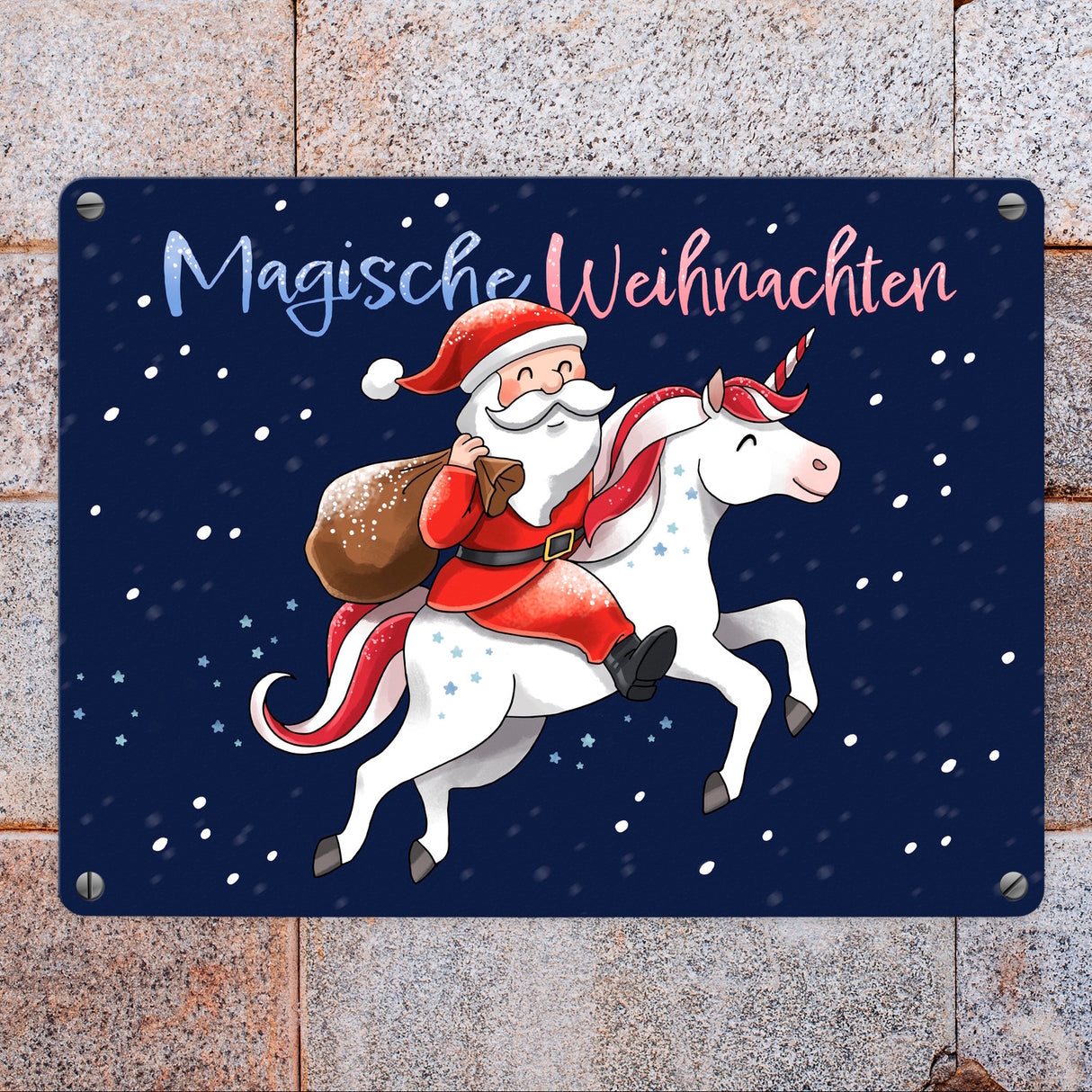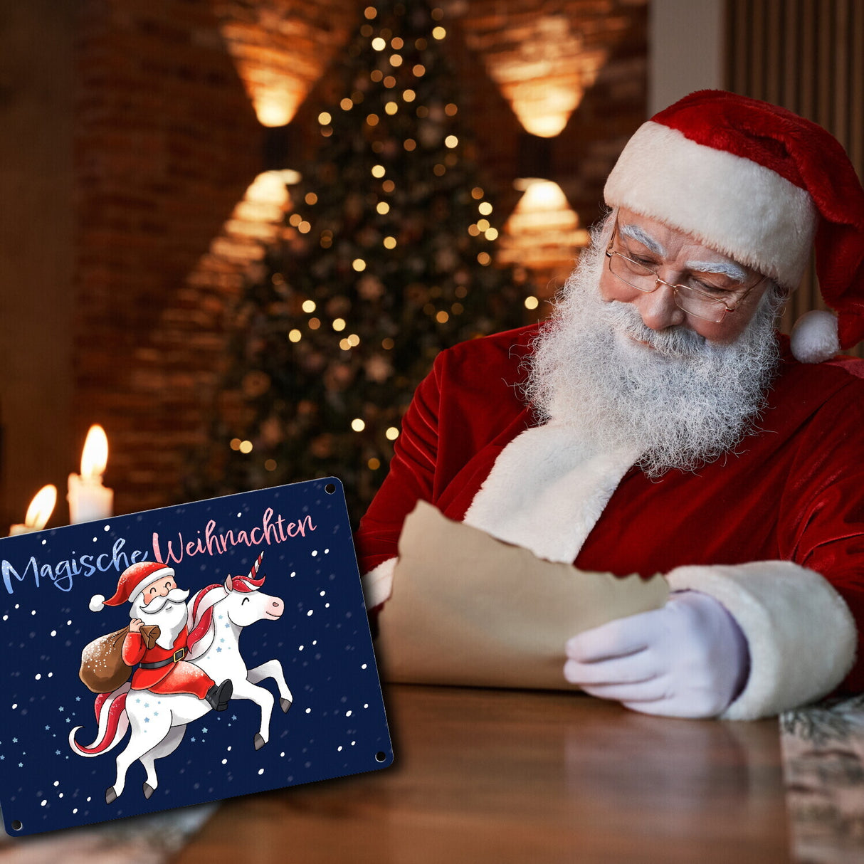 - 1x Weihnachtsmann auf Einhorn Metallschild in 15x20 cm mit Spruch Magische Weihnachten in der gewählten Größe