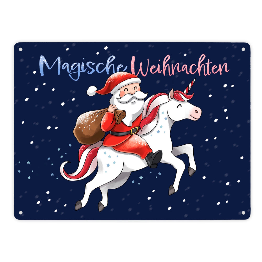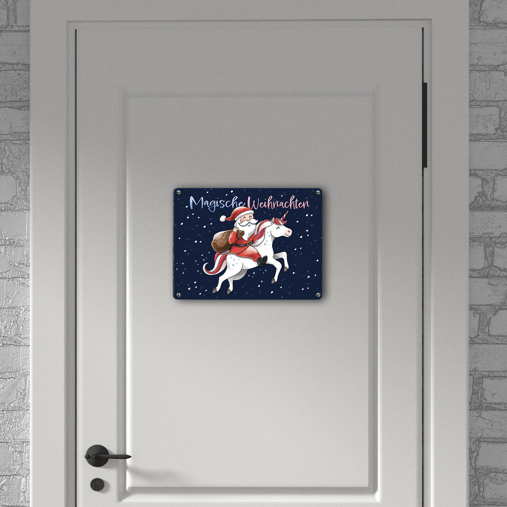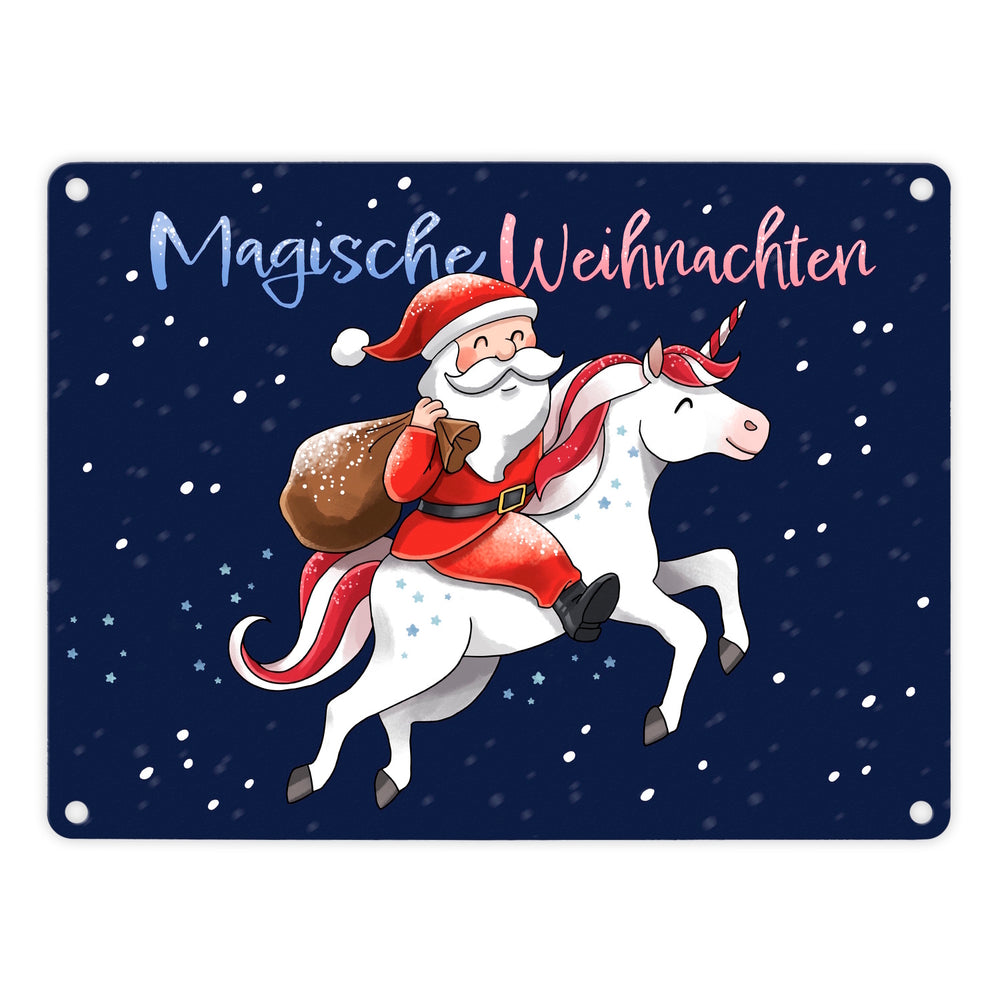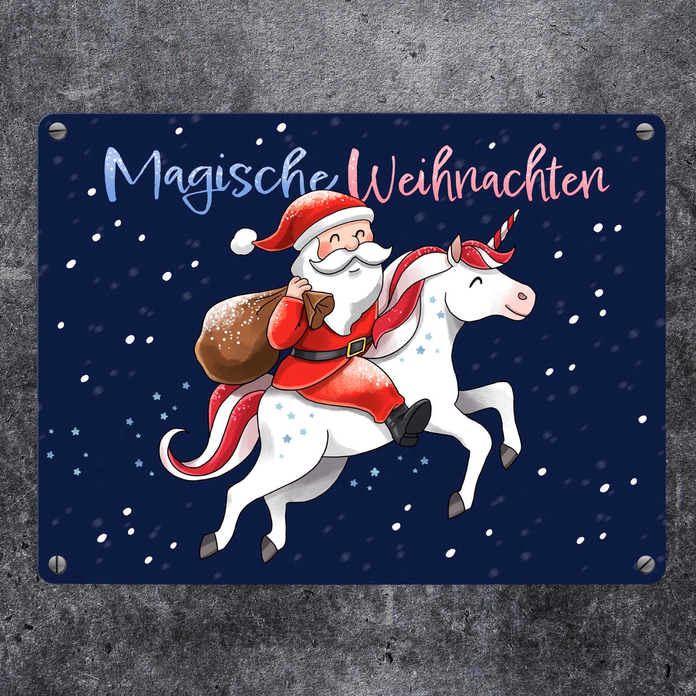 - 1x Weihnachtsmann auf Einhorn Metallschild in 15x20 cm mit Spruch Magische Weihnachten in der gewählten Größe