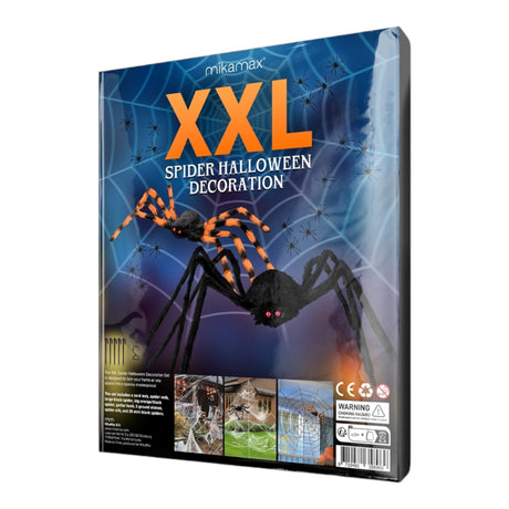 - 1x XXL Spinnen Halloween Hausdekoration mit 20 kleinen Spinnen bestehend aus 2x XXL Spinnen, 1x Gartennetz, 1x Spinnennetz, 1x Dachrinnenhaken, 5x Erdnägel, 1x Spinnenseide und 20x kleine Spinnen.