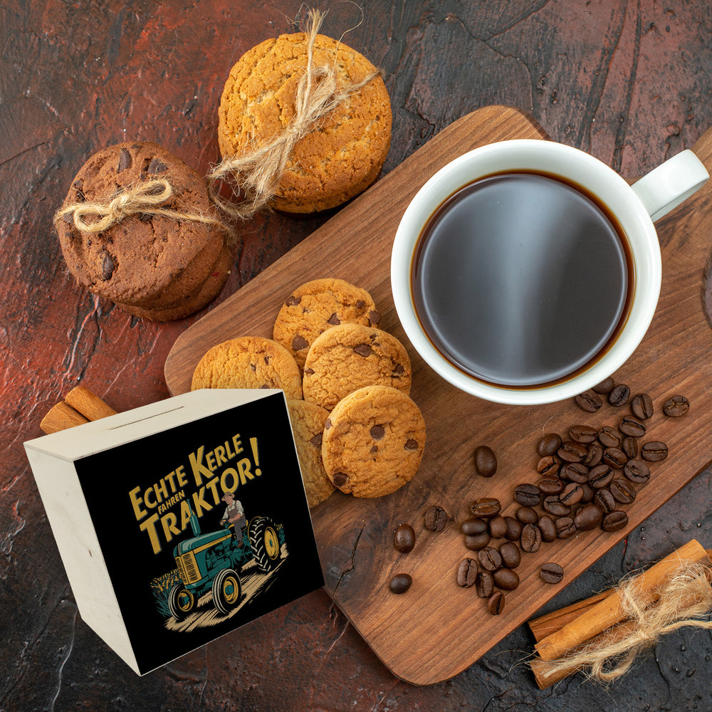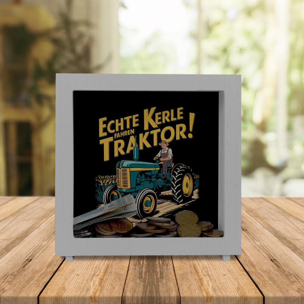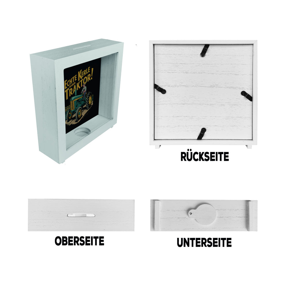 Erleben Sie die Faszination des Landlebens mit unserer einzigartigen Echte Kerle fahren Traktor Spardose! Perfekt für alle, die von der Weite der Felder und dem Charme der Landwirtschaft träumen. Diese Spardose ist nicht einfach nur ein Ort, um Ihre Münzen zu verwahren – sie ist ein kleines Stück Nostalgie zum Anfassen.Stellen Sie sich vor, Ihr kleiner Bauer, glücklich und stolz, tuckert auf seinem grünen Traktor über sonnenverwöhnte Felder. Die gelben Akzente der Spardose strahlen förmlich Sommerfreude aus. Es ist nicht nur ein Aufbewahrungsort, sondern ein humorvoller Akzent für Ihr Zuhause, sei es in der Küche, im Wohnzimmer oder in der Werkstatt.Erhältlich in drei charmanten Varianten – schlicht in Holz, edel in Keramik und als Rahmen mit Sichtfenster für besondere Geldgeschenke. Jeder Druck erfolgt mit Liebe in Deutschland und verleiht Ihrem Sparen einen nostalgischen Touch. Ideal für Geburtstage, als Dekoration oder einfach, um Ihre Sammelleidenschaft aufzupeppen.Schaffen Sie mit unserem Traktor-SPARtractor Ihre eigene Erntezeit zu Hause und inspirieren Sie andere, stilvoll und mit einem Augenzwinkern zu sparen. Denn echte Kerle fahren eben Traktor und lassen damit ihre Ersparnisse wachsen!
