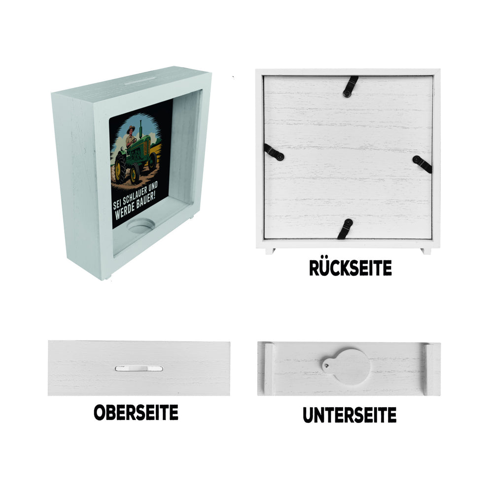 Stell dir vor, wie du im sanften Licht des Sonnenaufgangs über das Land fährst, das goldene Korn um dich tänzelnd. So ein Traum mag nah scheinen, aber ein Traum ohne Plan bleibt einfach nur ein Traum. Darum brauchen leidenschaftliche Sparfüchse und angehende Landliebhaber unsere Bauer auf grünem Traktor Spardose – Sei schlauer, werde Bauer! Mit einem Hauch Nostalgie und einem Augenzwinkern bringt dieser freudige Bauer im Retro-Look auf seinem fröhlich-grünen Traktor das Land direkt in dein Zuhause. Es ist nicht nur ein Ort, um dein erspartes Kleingeld zu deponieren, sondern eine Inspiration für finanzielle Abenteuer. Egal ob einfach rustikale Holzoptik, elegante Keramik oder die raffinierte Holzrahmenvariante mit Sichtfenster – jede Spardose wird in unserer deutschen Manufaktur mit Liebe gefertigt und wartet darauf, deine Münzen sicher aufzubewahren.Zusätzlich sorgt der witzige Slogan 'Sei schlauer und werde Bauer' für ein Schmunzeln und erinnert daran, dass jeder kleine Beitrag zu großen Veränderungen führen kann. Überrasche jemanden mit diesem originellen Präsent und schüre die Sehnsucht nach dem Landleben oder einfach nach einer cleveren Sparstrategie! Erfreue dich an diesem charmanten Begleiter, der nicht nur deinem Portemonnaie, sondern auch deiner Seele guttun wird.