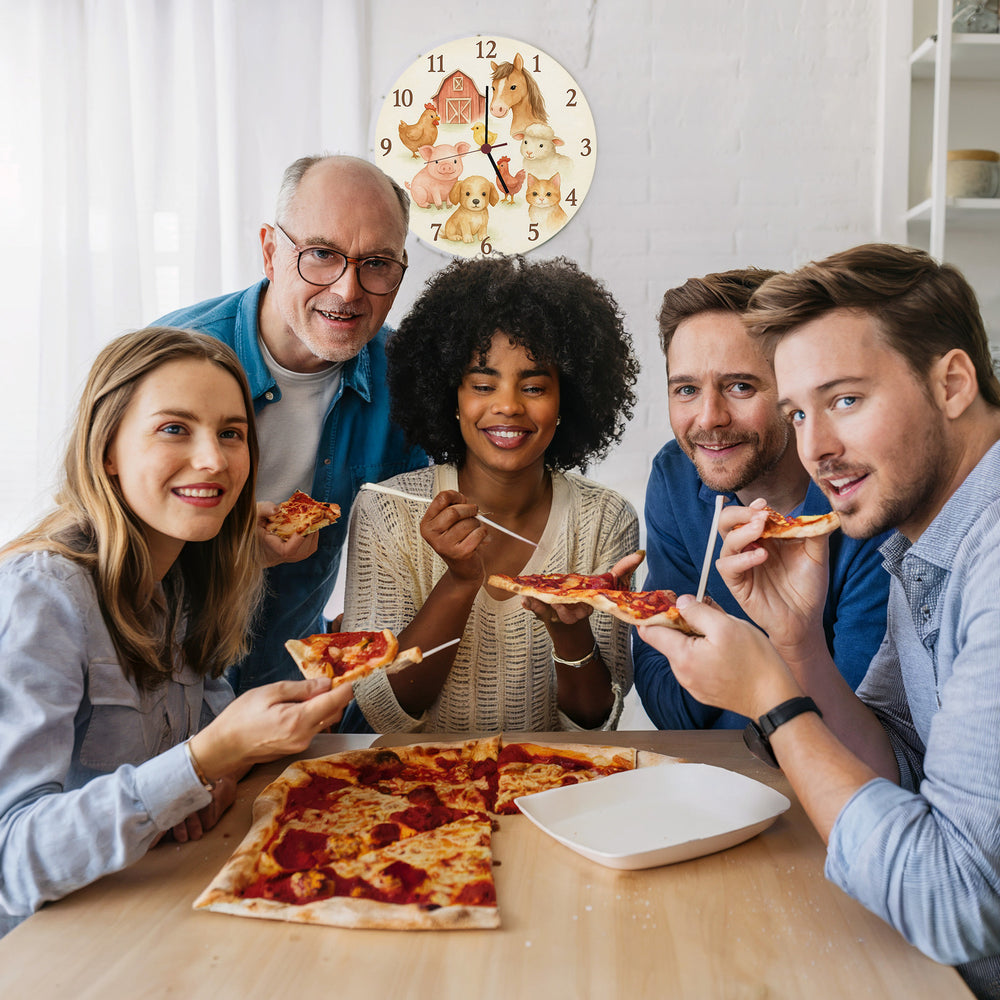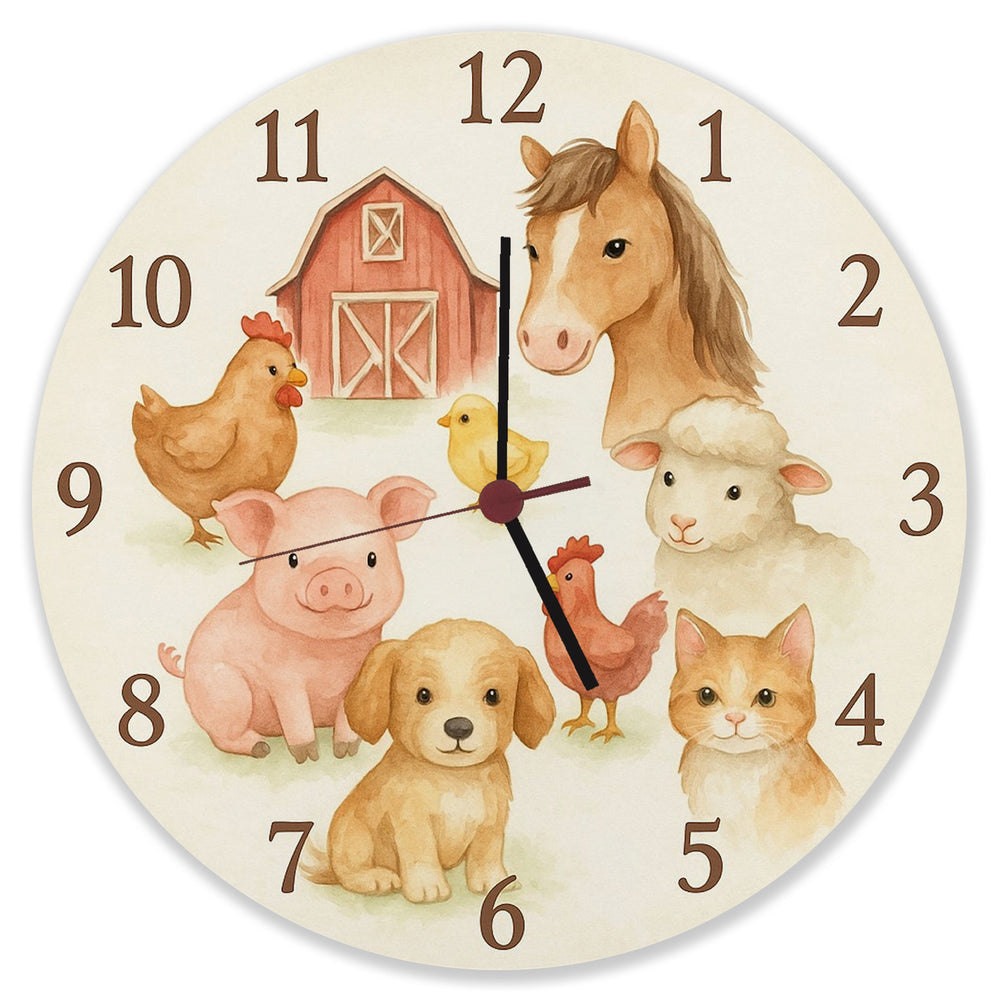 - Diese bezaubernde Wanduhr zaubert mit Aquarell-Bauernhoftieren ländlichen Charme ins Kinderzimmer. Auf dem sanft cremefarbenen Zifferblatt tummeln sich ein Pferd, Hahn, Küken, Schwein, Hund, Schaf, Katze und Huhn um eine rote Scheune. Die Uhr kombiniert weiche Kanten und sanfte Farben für eine kinderfreundliche, verspielte Ästhetik.