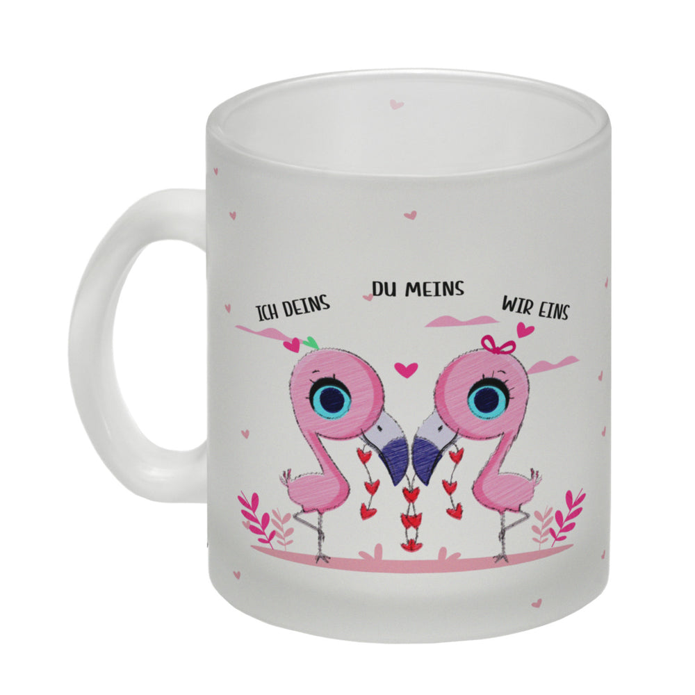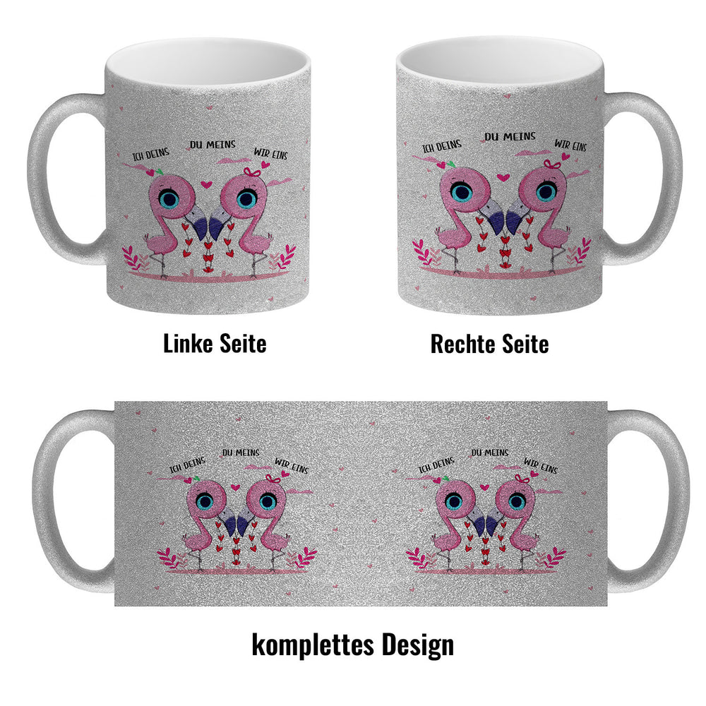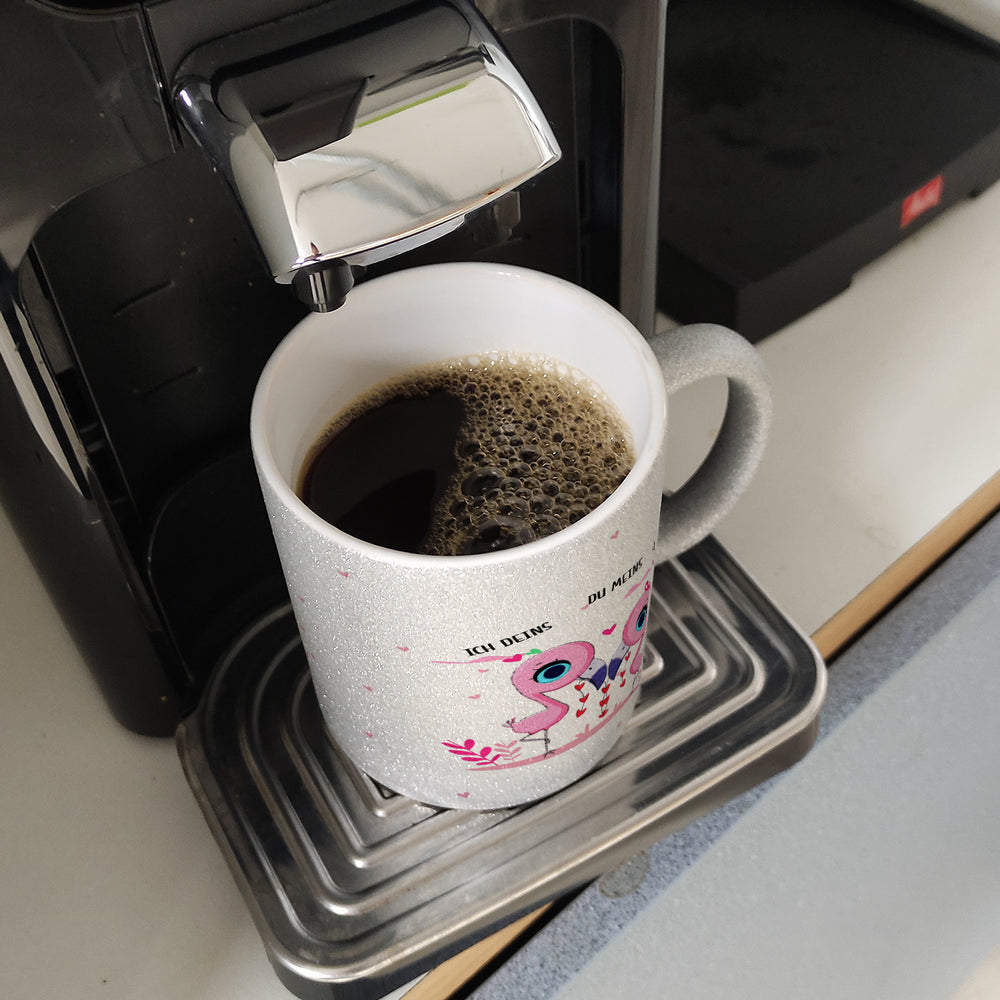 Verliebe dich in die Flamingo Pärchen Kaffeebecher mit Spruch! Dieser einzigartige Kaffeebecher ist das perfekte Geschenk für deinen Partner zum Valentinstag. Mit einem ansprechenden Motiv aus zwei Flamingos und dem süßen Spruch «Ich deins du meins wir eins» kannst du deiner Liebe ganz besondere Aufmerksamkeit schenken. Die romantische Tasse ist aus hochwertigem Porzellan gefertigt und mit viel Liebe in Handarbeit hergestellt. Erhältlich ist der Kaffeebecher in verschiedenen Varianten: Als weiße Standardtasse, mit farbigen Henkel und Innenseite, als edle Glastasse oder in der exklusiven Silberedition mit Glitzereffekt. Genieße gemeinsam erholsame Momente beim Kaffeetrinken und lass die Liebe zu zweit wachsen. Mit der Flamingo Pärchen Kaffeebecher Tasse schenkst du deinem Partner ein unvergessliches Erlebnis und stärkst die Beziehung auf ganz besondere Weise. Egal ob im Büro oder zu Hause, dieser Becher bereitet überall Freude!