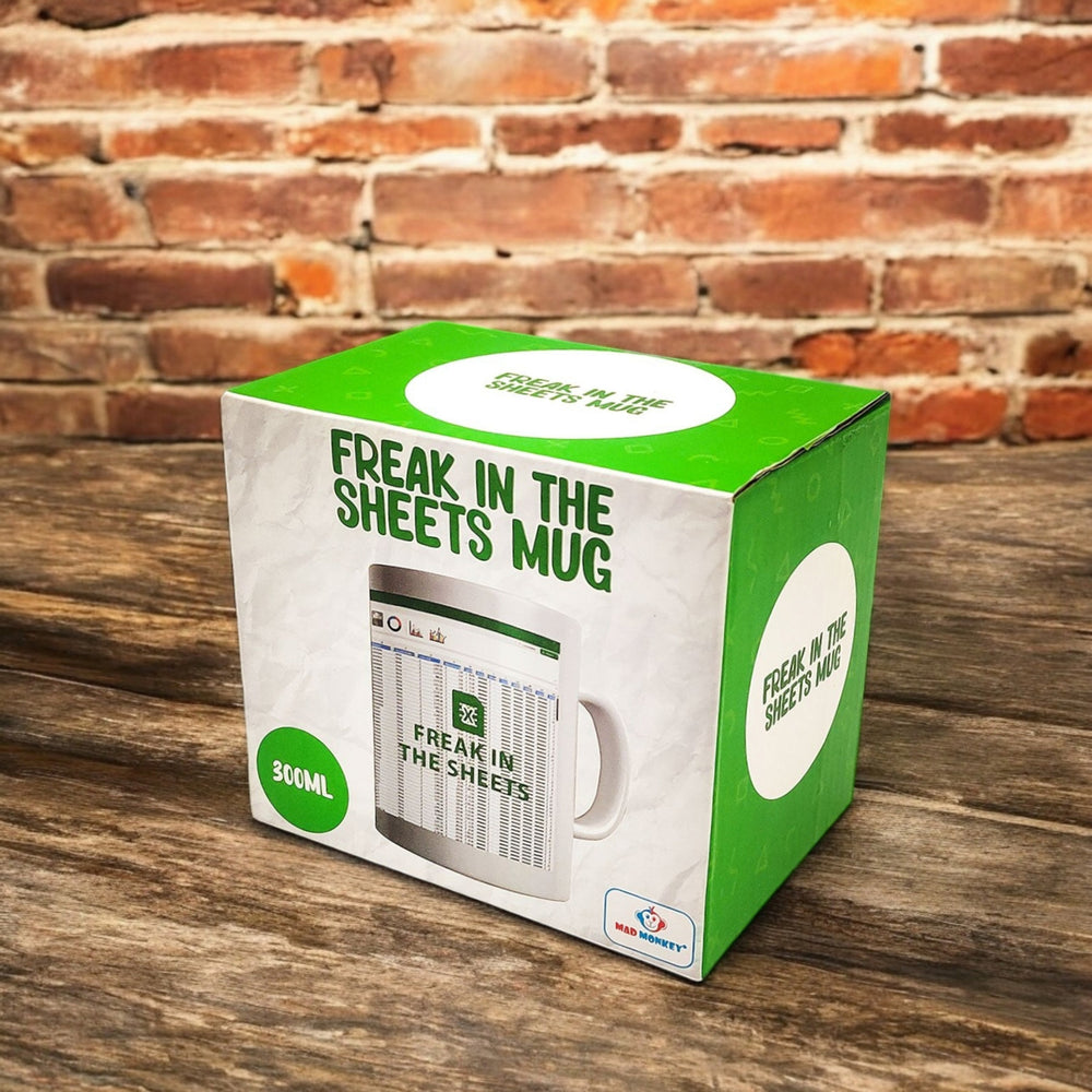 • Diese witzige Kaffeetasse zeigt eine detaillierte Tabelle aus einem Tabellenkalkulationsprogramm und trägt stolz den Spruch „Freak in the Sheets“ in der Mitte. Aus robuster Keramik gefertigt, bietet sie 300 ml deines Lieblingskaffees (oder Tees) Platz.