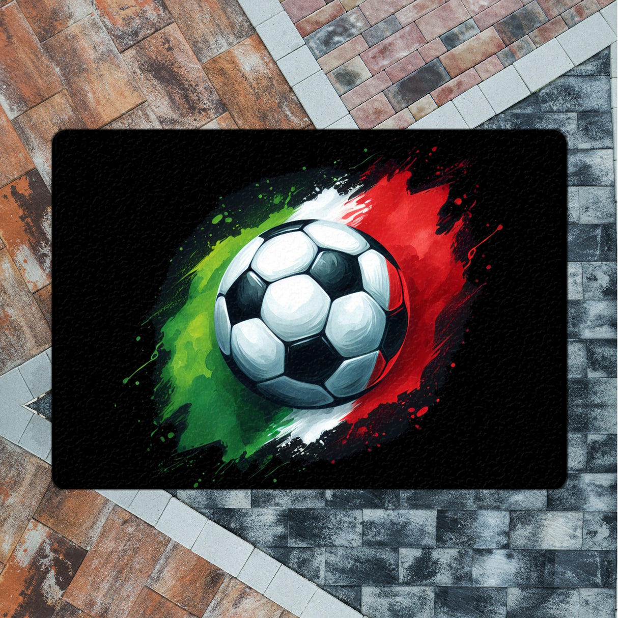 • Diese schicke Fußmatte mit der Fußball Italien Flagge bringt EM 2024-Stimmung direkt vor die Tür! Ein bunter Ball in den Farben Grün, Weiß und Rot wartet nur darauf, begrüßt zu werden. Perfekt für alle Fußball-Fans und Heimdekorations-Liebhaber!