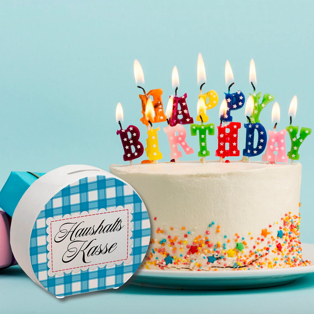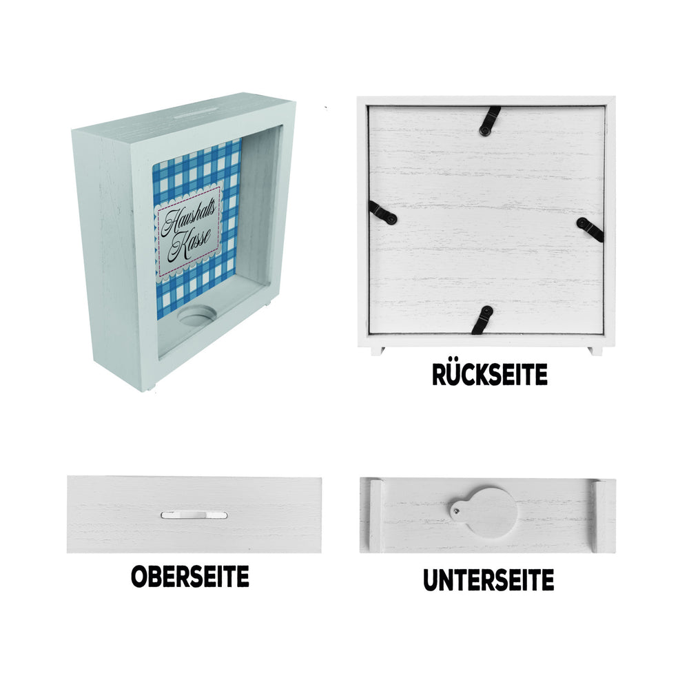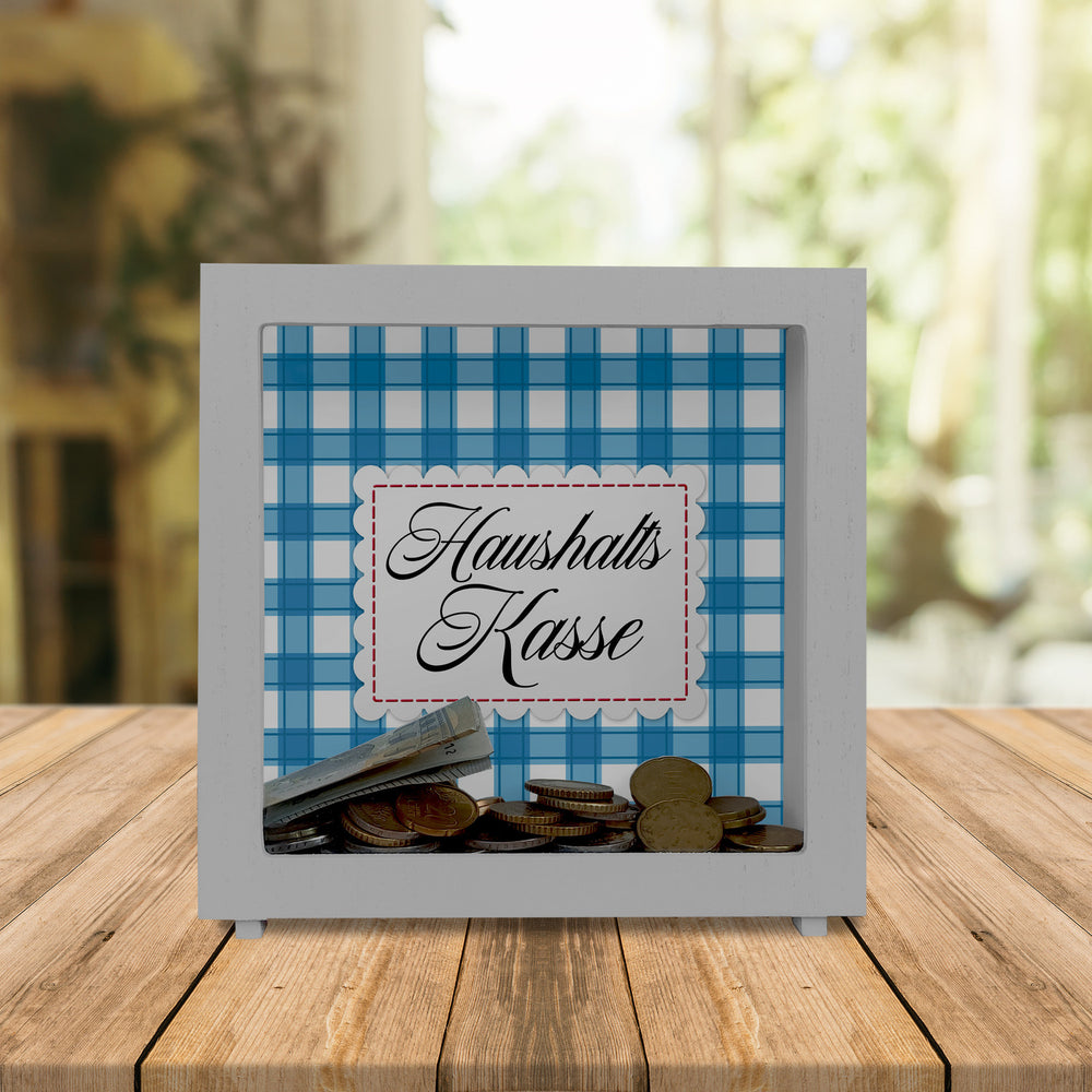 - 1x Haushaltskasse Spardose mit blau-weiß kariertem Muster in der gewählten Ausführung