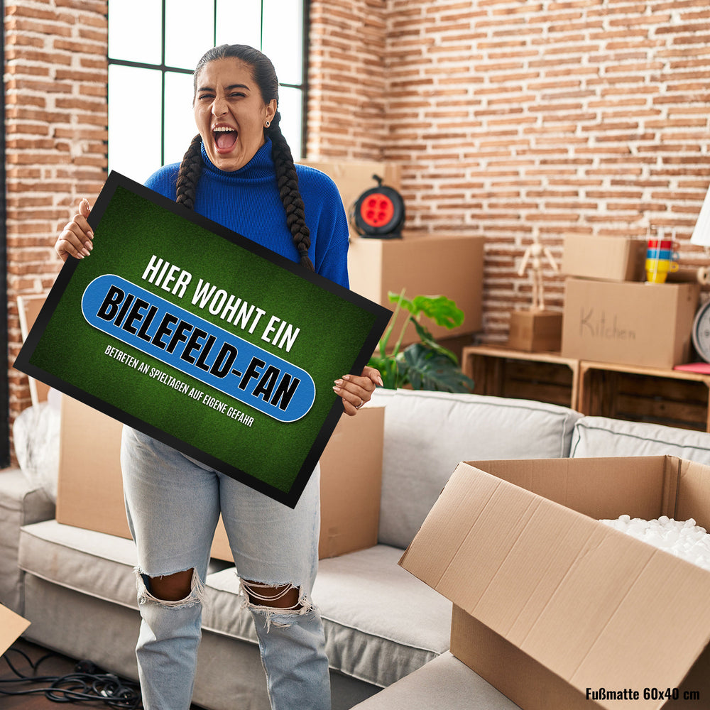 Diese Fußmatte ist für jeden Bielefeld-Fan ein absolutes Muss! Sie ist in den Größen 50x35cm, 60x40cm und 75x50cm erhältlich und besteht aus pflegeleichter Kunstfaser mit praktischer rutschfester Gummiunterseite und niedrigem Gummirand. Mit Sorgfalt bedruckt in unserer Fußmatten-Manufaktur in Deutschland. Der passende Spruch „Hier wohnt ein Bielefeld-Fan“ lässt deine Gäste schon an der Haustüre wissen, dass es bei dir rund her geht. Dank der Fußmatte bist du bestens vorbereitet auf die Spieltage, an denen du deiner Leidenschaft dem Fußball frönen kannst. Diese Fußmatte ist ein absolutes Muss für jeden Bielefeld-Fan!