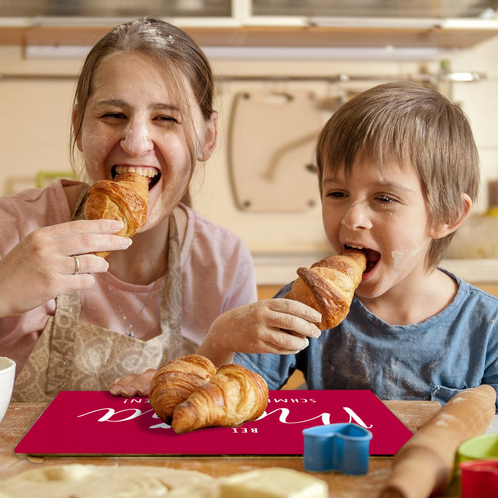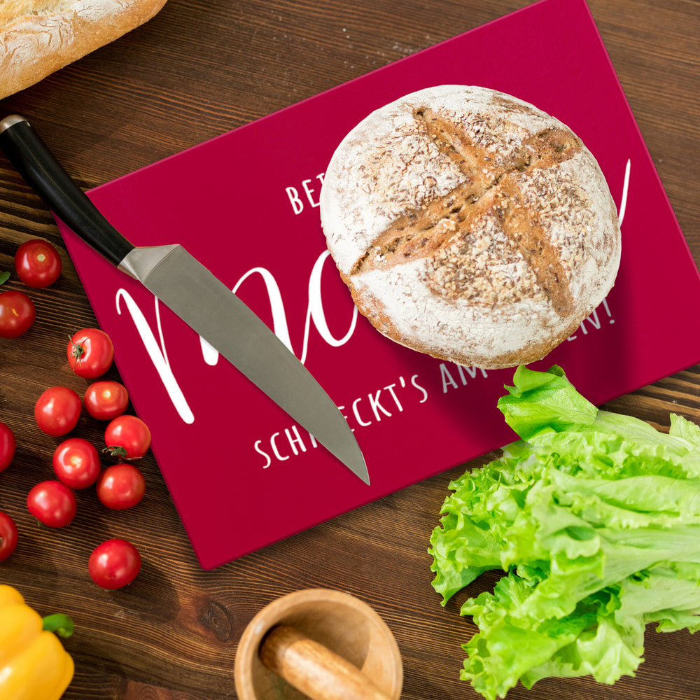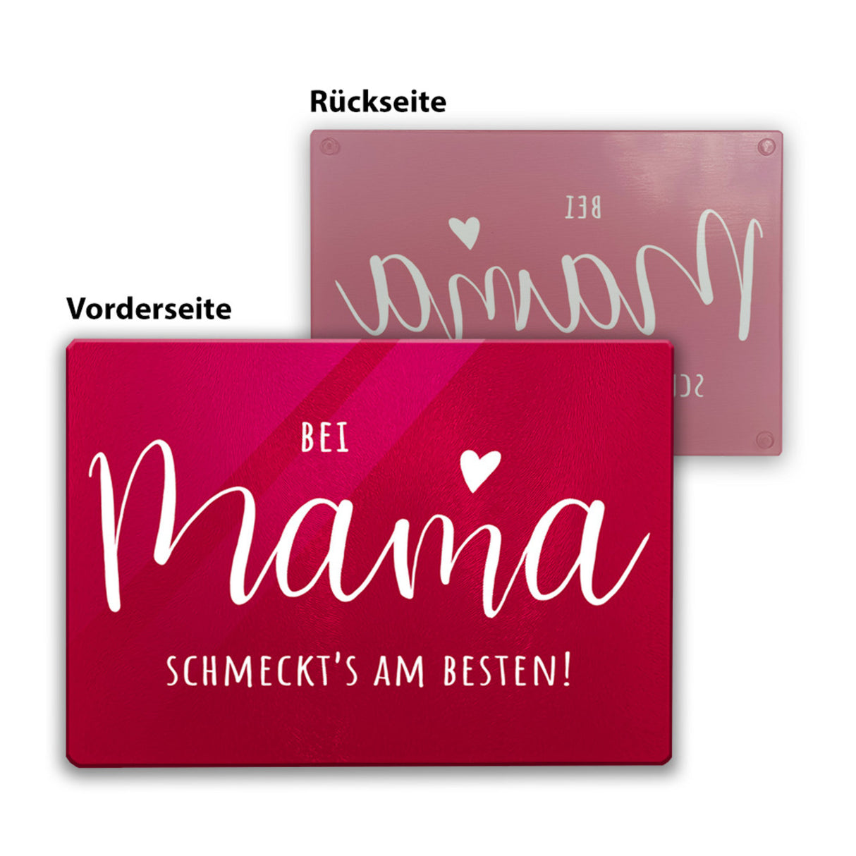 - 1x Mama kocht am besten Schneidebrett aus Glas Glas mit Spruch Bei Mama schmeckt‘s am besten in der gewählten Größe