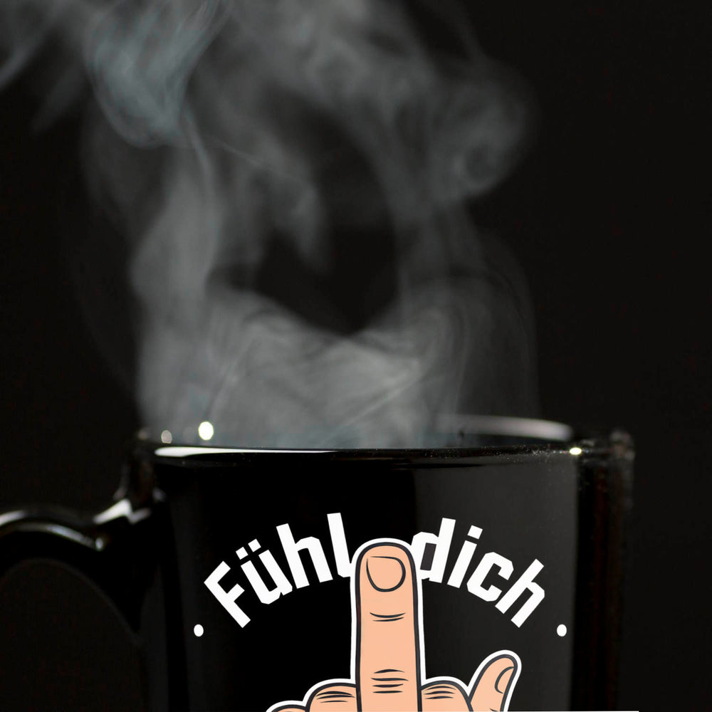 - Mit ihrem robusten schwarzen Design und dem frechen Mittelfinger-Motiv lässt diese Tasse keine Zweifel aufkommen. Der Spruch ‘Fühl dich gemittelfingert’ sorgt für ein schmunzelndes Stirnrunzeln und ist ein echter Hingucker – ideal für Rebellinnen und Rebellen, die ihren Kaffee mit schwarzem Humor genießen.