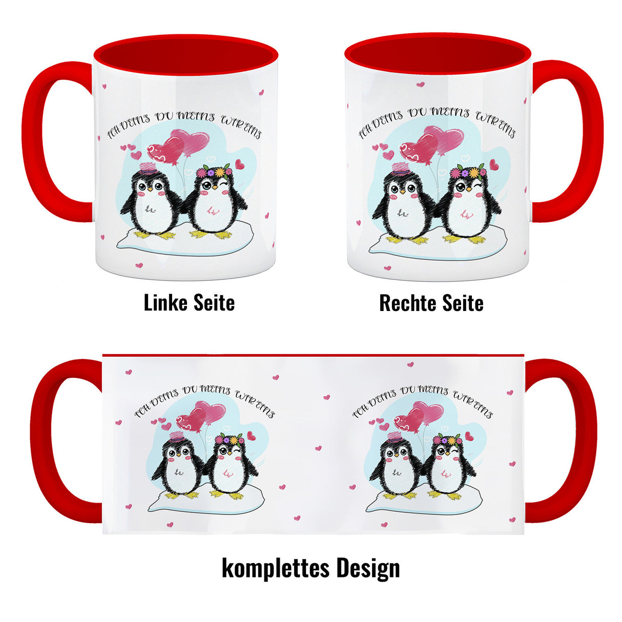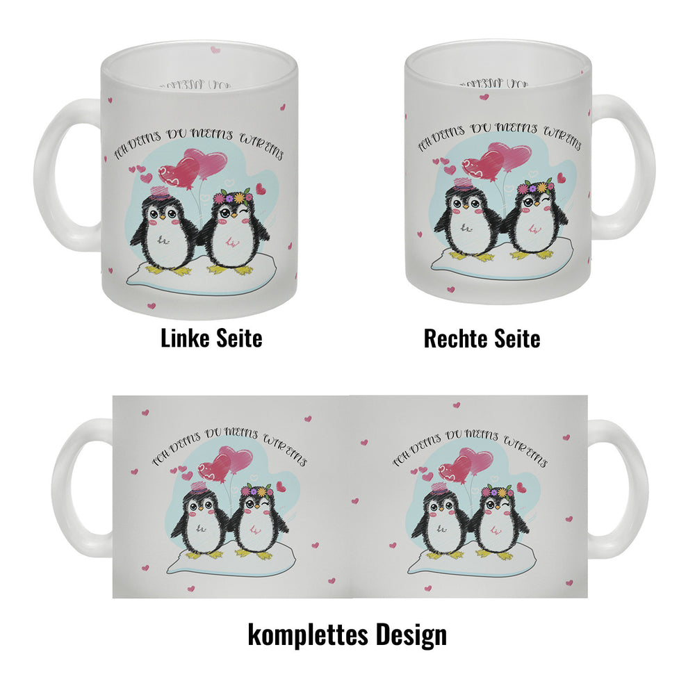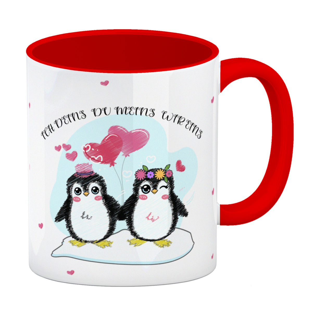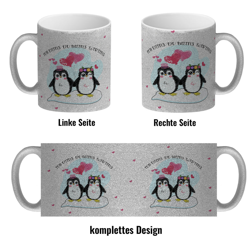 Dieser Kaffeebecher mit Pinguin-Motiv ist das perfekte Geschenk, um deinen Partner zu überraschen und ihm eine großartige Liebeserklärung zu machen. Der Becher ist mit dem niedlichen Spruch „Ich deins Du meins Wir eins“ bedruckt und unterstreicht die Verbundenheit zwischen Euch beiden. Der Kaffeebecher ist in verschiedenen Varianten erhältlich - als weiße Standardtasse, mit farbigem Henkel und Innenseite, als edle Glastasse oder in der exklusiven Silberedition mit Glitzereffekt. Sorgfältig und liebevoll in Deutschland hergestellt, wird jeder Kaffeegenuss zu einem Zeichen der Verbundenheit. Überrasche deinen Partner oder deine Partnerin doch mal mit diesem tollen Geschenk! Mit dem originellen Design kannst du den Kaffeebecher nicht nur für das Büro, sondern auch für zuhause verwenden. Egal ob als Geburtstagsgeschenk oder als Liebesbeweis, dieser Pinguin Kaffeebecher ist einfach perfekt!